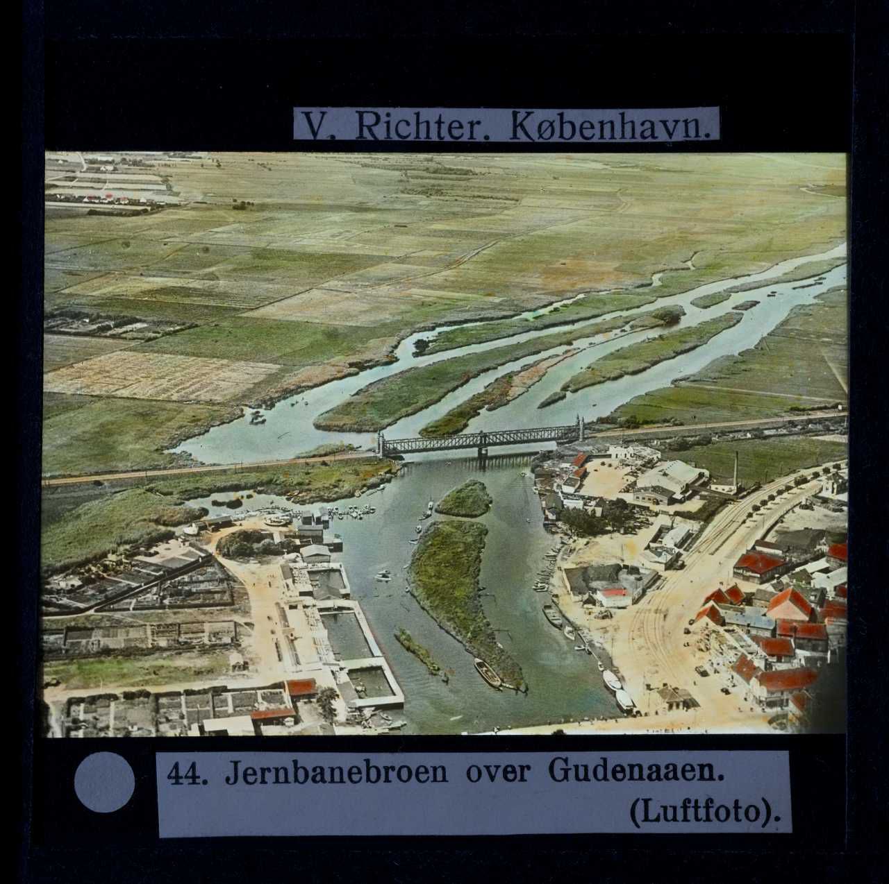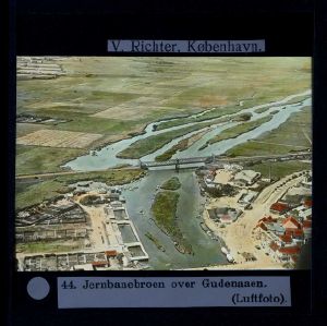 Billedet er håndkoloreret og stammer fra lysbilledserie nr. 222 benævnt "Gennem Østjylland". På dias er påsat labels: "V. Richter. København." og "44. Jernbanebroen over Gudenaaen. (Luftfoto).". I serien er 55 lysbilleder. Firmaet V. Richter producerede, kuraterede og distribuerede lysbilledserier i primært 1920'erne og 1930'erne. Dias måler ca. 8 x 8 cm.