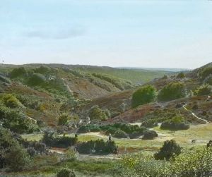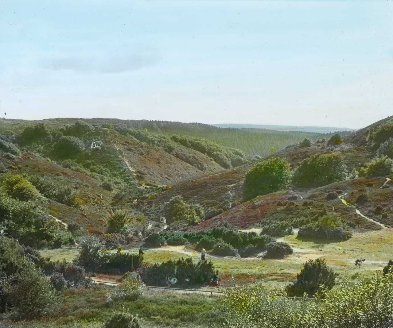 Billedet er håndkoloreret og stammer fra lysbilledserie nr. 222 benævnt "Gennem Østjylland". På dias er påsat labels: "V. Richter. København." og "54. Ræbild Bakker.". I serien er 55 lysbilleder. Firmaet V. Richter producerede, kuraterede og distribuerede lysbilledserier i primært 1920'erne og 1930'erne. Dias måler ca. 8 x 8 cm.