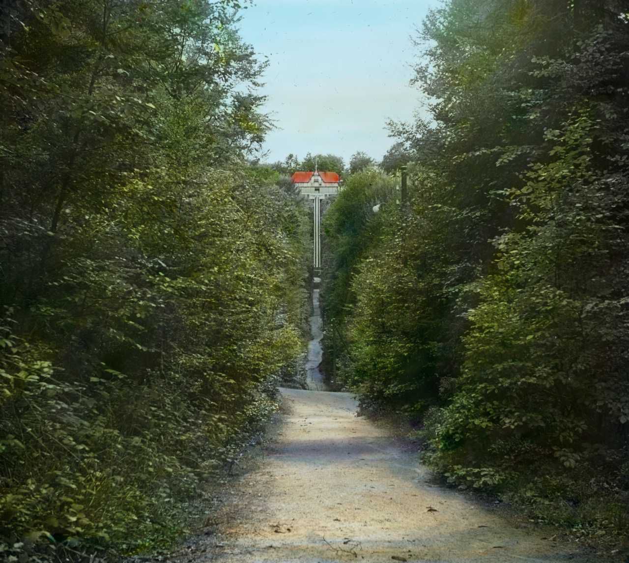 Billedet er håndkoloreret og stammer fra lysbilledserie nr. 222 benævnt "Gennem Østjylland". På dias er påsat labels: "V. Richter. København." og "20. Munkebjerg (Den rullende Trappe).". I serien er 55 lysbilleder. Firmaet V. Richter producerede, kuraterede og distribuerede lysbilledserier i primært 1920'erne og 1930'erne. Dias måler ca. 8 x 8 cm.