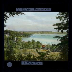 Titel hentet fra original dias. Billedet er håndkoloreret og stammer fra lysbilledserie nr. 222 benævnt "Gennem Østjylland". På dias er påsat labels: "V. Richter. København." og "19. Vejle Fjord.". I serien er 55 lysbilleder. Firmaet V. Richter producerede, kuraterede og distribuerede lysbilledserier i primært 1920'erne og 1930'erne. Dias måler ca. 8 x 8 cm.