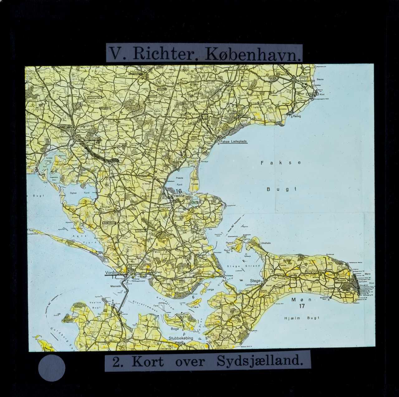 Titel hentet fra original dias. Billedet er håndkoloreret og stammer fra lysbilledserie nr. 221 benævnt "Sydsjælland". På dias er påsat labels: "V. Richter. København." og "2. Kort over Sydsjælland.". I serien er 38 lysbilleder. Firmaet V. Richter producerede, kuraterede og distribuerede lysbilledserier i primært 1920'erne og 1930'erne. Dias måler ca. 8 x 8 cm.