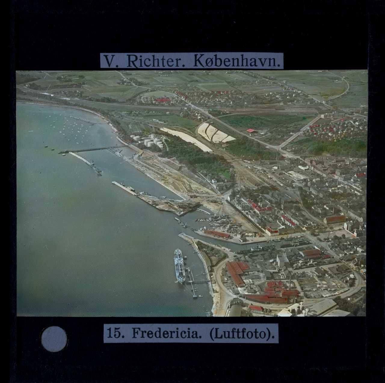 Billedet er håndkoloreret og stammer fra lysbilledserie nr. 222 benævnt "Gennem Østjylland". På dias er påsat labels: "V. Richter. København." og "15. Fredericia. (Luftfoto).". I serien er 55 lysbilleder. Firmaet V. Richter producerede, kuraterede og distribuerede lysbilledserier i primært 1920'erne og 1930'erne. Dias måler ca. 8 x 8 cm.