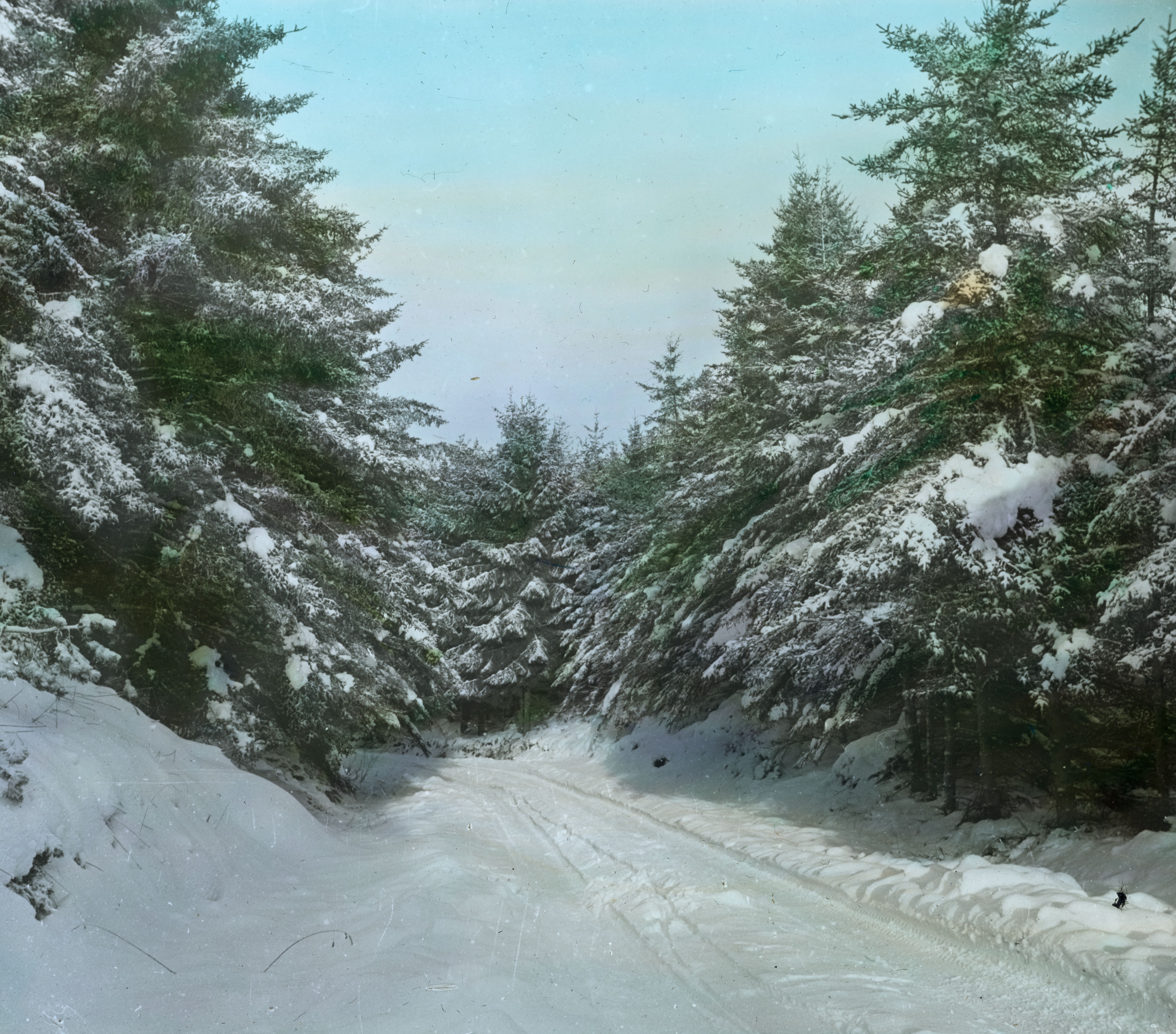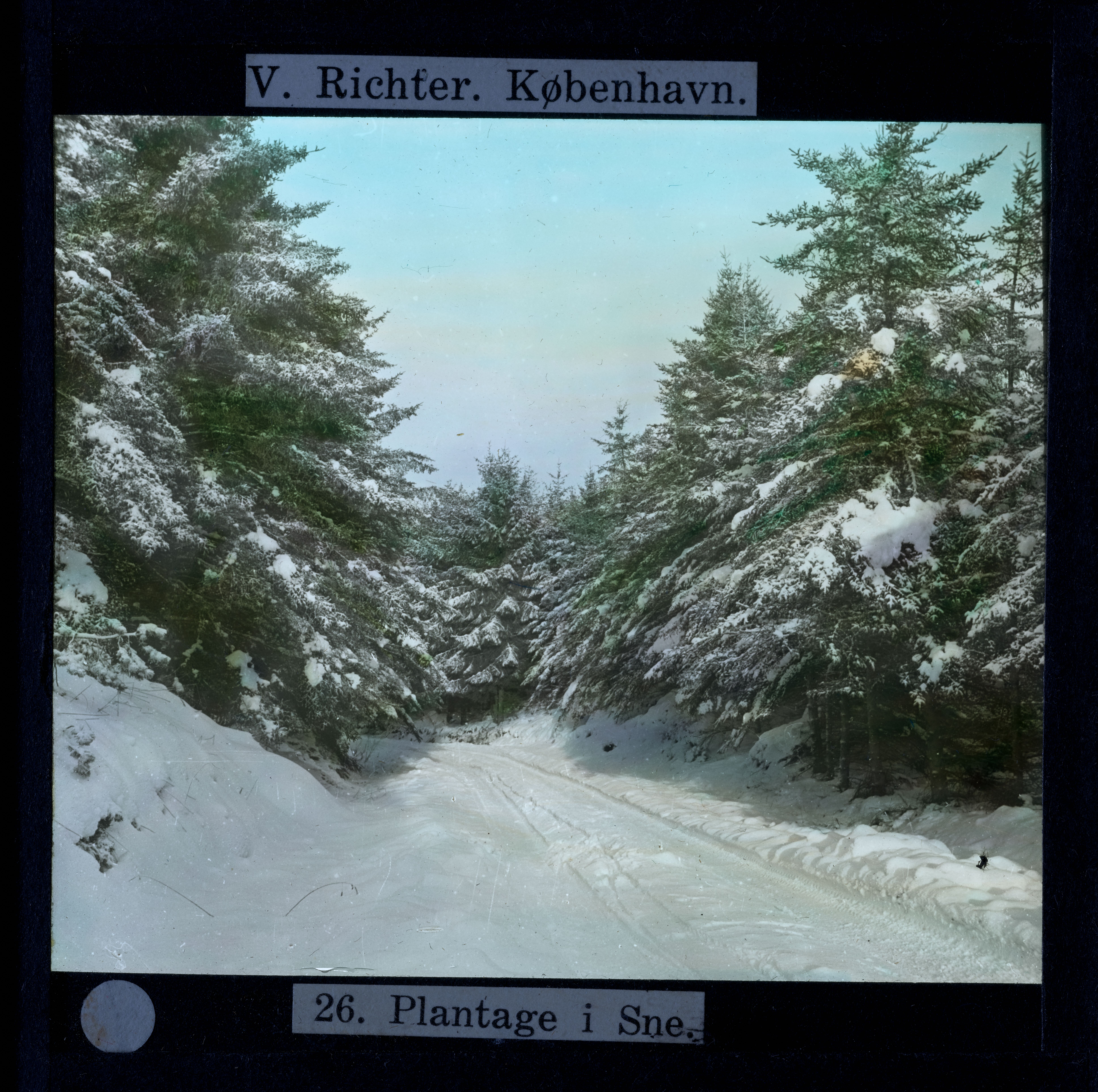Titel hentet fra original dias. Billedet er håndkoloreret og stammer fra lysbilledserie nr. 223 benævnt "Midtjylland". På dias er påsat labels: "V. Richter. København." og "26. Plantage i Sne.". I serien er 52 lysbilleder. Firmaet V. Richter producerede, kuraterede og distribuerede lysbilledserier i primært 1920'erne og 1930'erne. Dias måler ca. 8 x 8 cm.