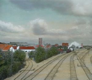 Billedet er håndkoloreret og stammer fra lysbilledserie nr. 223 benævnt "Midtjylland". På dias er påsat labels: "V. Richter. København." og "55. Grindsted. Udsigt fra Viadukten.". I serien er 52 lysbilleder. Firmaet V. Richter producerede, kuraterede og distribuerede lysbilledserier i primært 1920'erne og 1930'erne. Dias måler ca. 8 x 8 cm.
