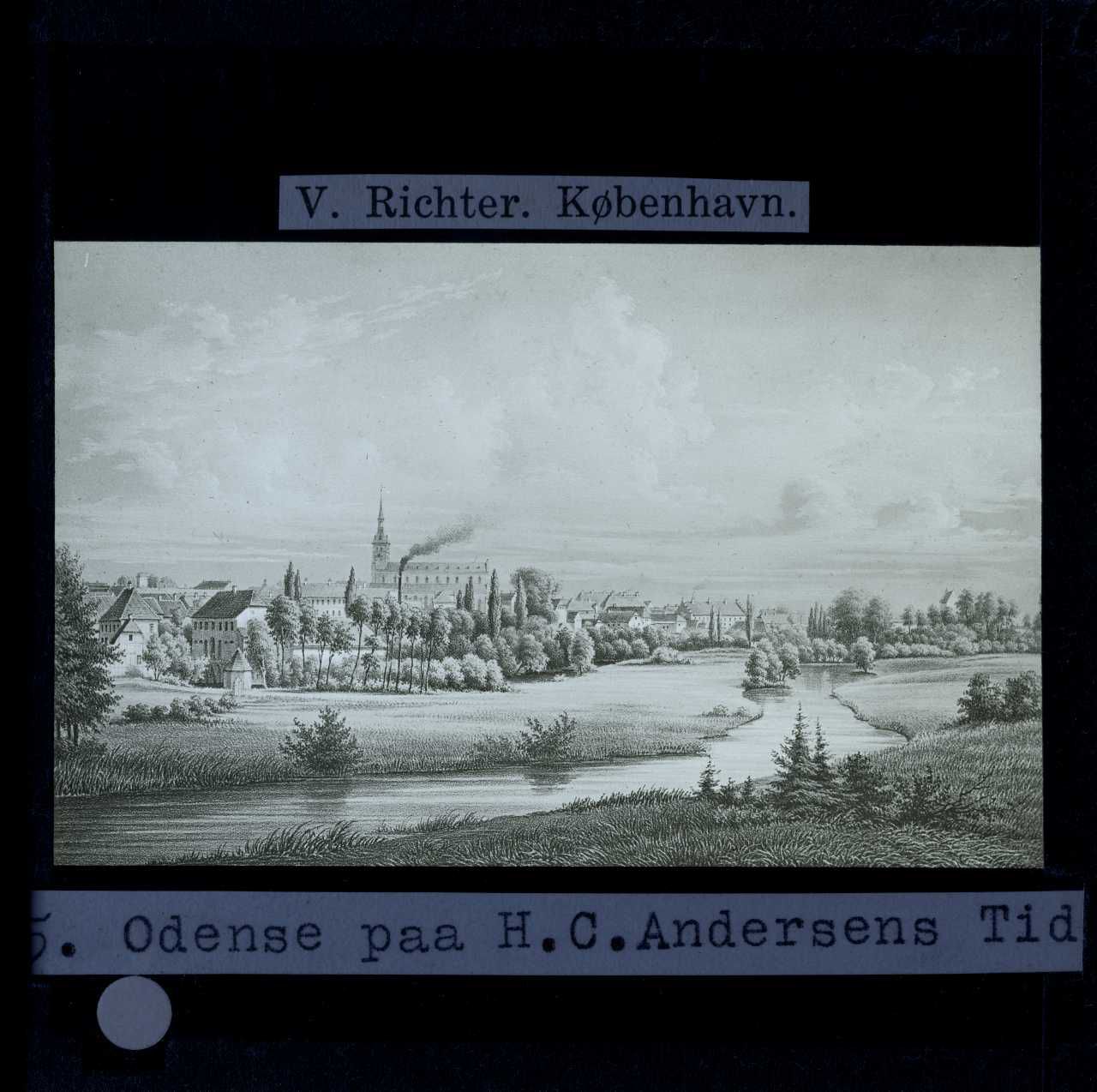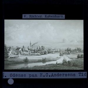 Billedet er sort-hvid og stammer fra lysbilledserie nr. 226 benævnt "De Sydfynske Øer". På dias er påsat labels: "V. Richter. København." og "5. Odense paa H.C. Andersens Tid". I serien er 37 lysbilleder. Firmaet V. Richter producerede, kuraterede og distribuerede lysbilledserier i primært 1920'erne og 1930'erne. Dias måler ca. 8 x 8 cm.