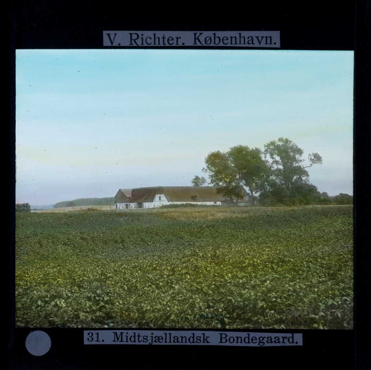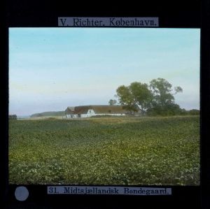 Billedet er håndkoloreret og stammer fra lysbilledserie nr. 246 benævnt "Midtsjælland". På dias er påsat labels: "V. Richter. København." og "31. Midtsjællandsk Bondegaard.". I serien er 33 lysbilleder. Firmaet V. Richter producerede, kuraterede og distribuerede lysbilledserier i primært 1920'erne og 1930'erne. Dias måler ca. 8 x 8 cm.