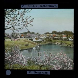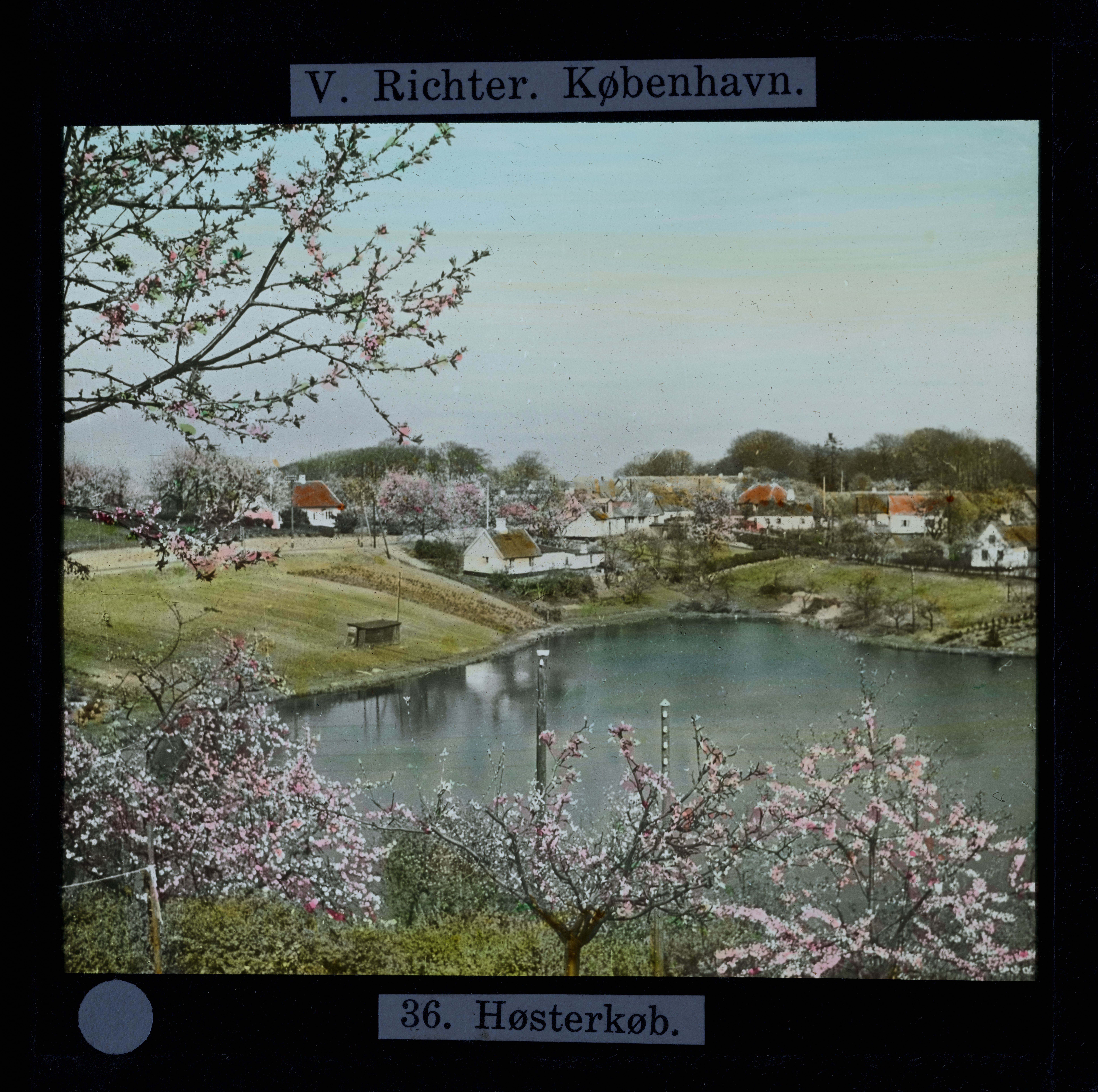 Titel hentet fra original dias. Billedet er håndkoloreret og stammer fra lysbilledserie nr. 245 benævnt "Nordsjælland". På dias er påsat labels: "V. Richter. København." og "36. Høsterkøb.". I serien er 44 lysbilleder. Firmaet V. Richter producerede, kuraterede og distribuerede lysbilledserier i primært 1920'erne og 1930'erne. Dias måler ca. 8 x 8 cm.