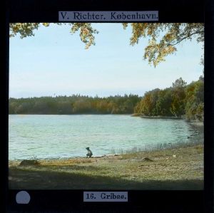 Titel hentet fra original dias. Billedet er håndkoloreret og stammer fra lysbilledserie nr. 245 benævnt "Nordsjælland". På dias er påsat labels: "V. Richter. København." og "16. Gribsø.". I serien er 44 lysbilleder. Firmaet V. Richter producerede, kuraterede og distribuerede lysbilledserier i primært 1920'erne og 1930'erne. Dias måler ca. 8 x 8 cm.