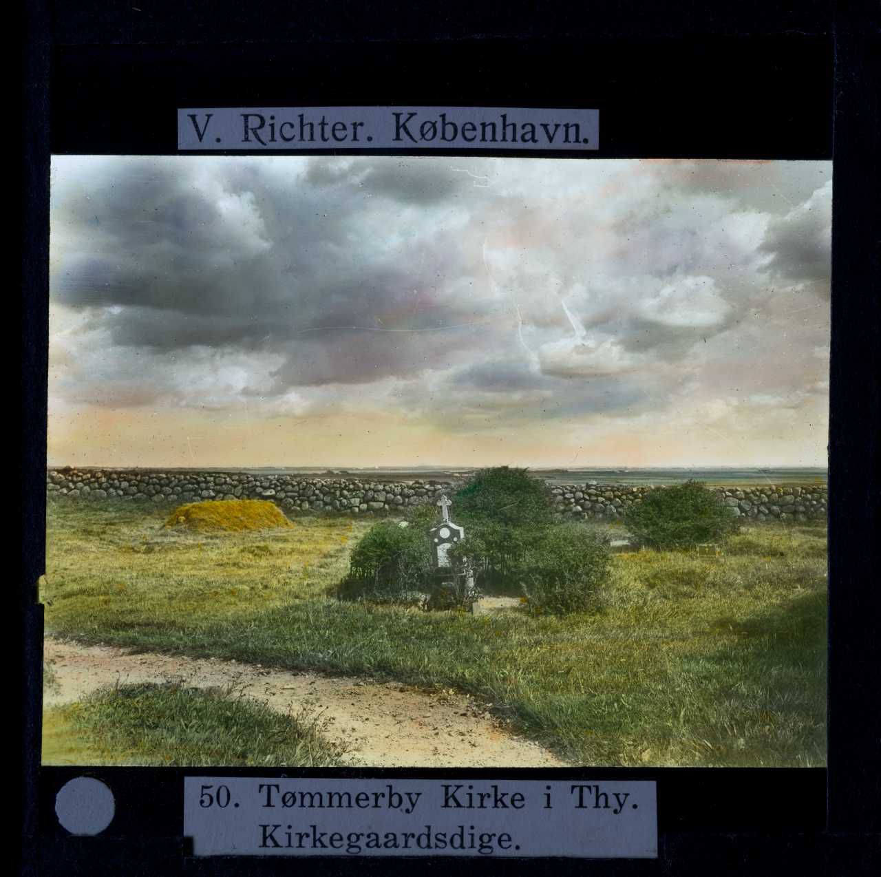 Billedet er håndkoloreret og stammer fra lysbilledserie nr. 247 benævnt "Danske Landsbykirker". På dias er påsat labels: "V. Richter. København." og "50. Tømmerby Kirke i Thy. Kirkegaardsdige.". I serien er 53 lysbilleder. Firmaet V. Richter producerede, kuraterede og distribuerede lysbilledserier i primært 1920'erne og 1930'erne. Dias måler ca. 8 x 8 cm.