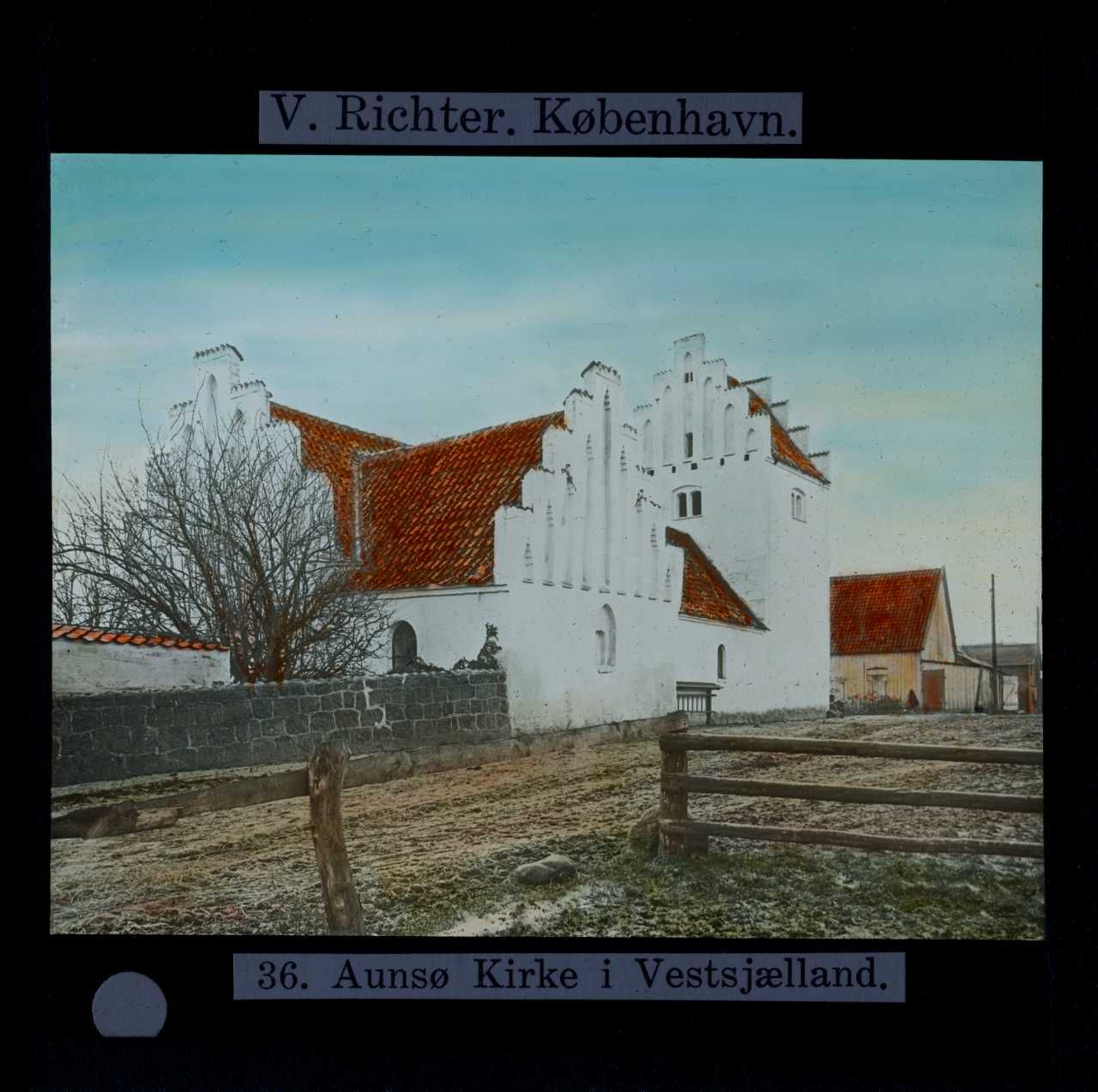 Billedet er håndkoloreret og stammer fra lysbilledserie nr. 247 benævnt "Danske Landsbykirker". På dias er påsat labels: "V. Richter. København." og "36. Aunsø Kirke i Vestsjælland.". I serien er 53 lysbilleder. Firmaet V. Richter producerede, kuraterede og distribuerede lysbilledserier i primært 1920'erne og 1930'erne. Dias måler ca. 8 x 8 cm.