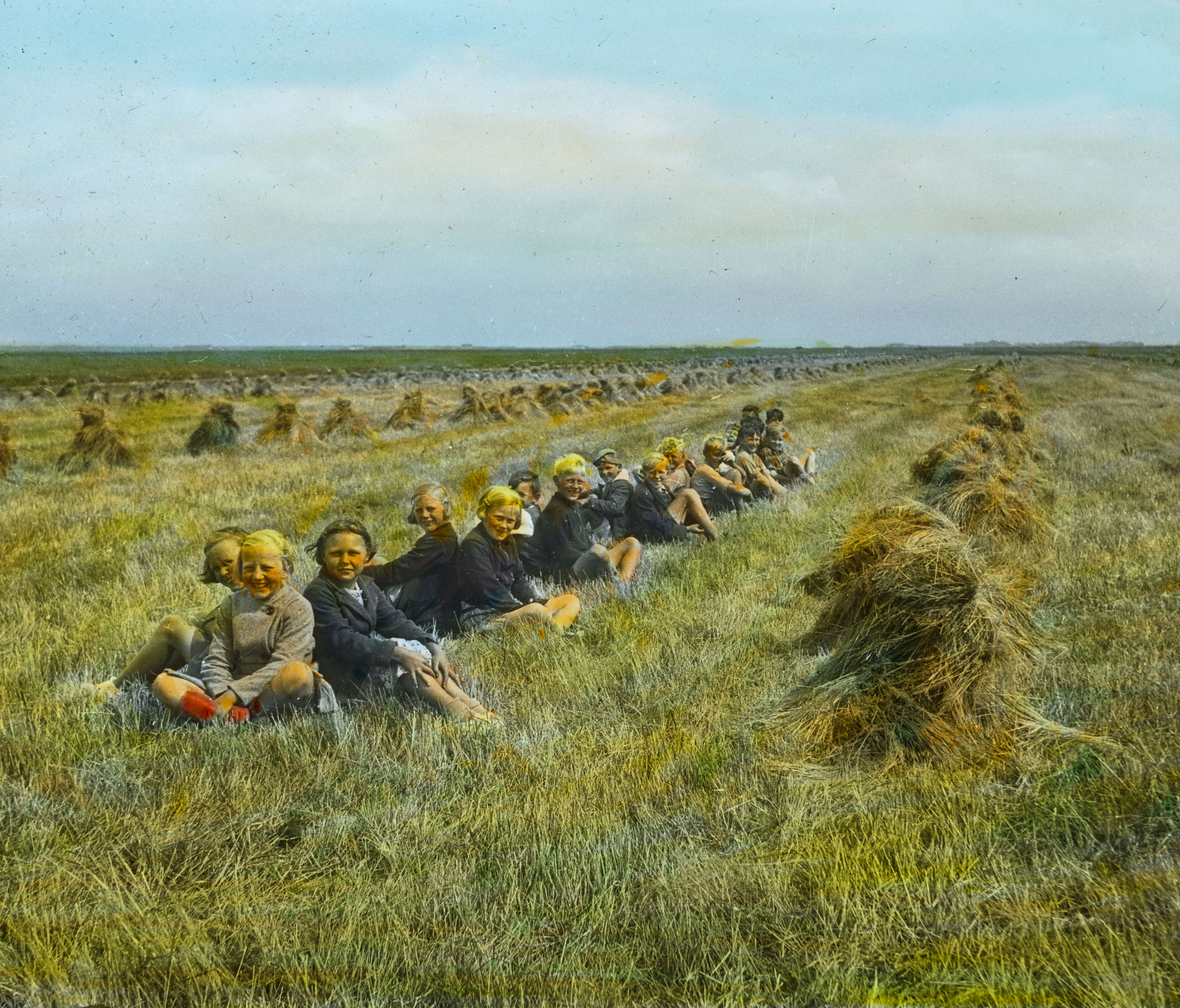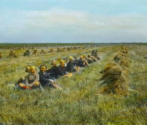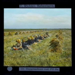 Titel hentet fra original dias. Billedet er håndkoloreret og stammer fra lysbilledserie nr. 248 benævnt "Vestjylland". På dias er påsat labels: "V. Richter. København." og "19. Rapgræshøst ved Fil Sø.". I serien er 59 lysbilleder. Firmaet V. Richter producerede, kuraterede og distribuerede lysbilledserier i primært 1920'erne og 1930'erne. Dias måler ca. 8 x 8 cm.