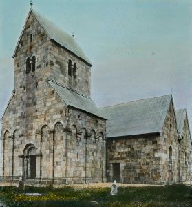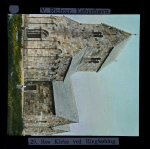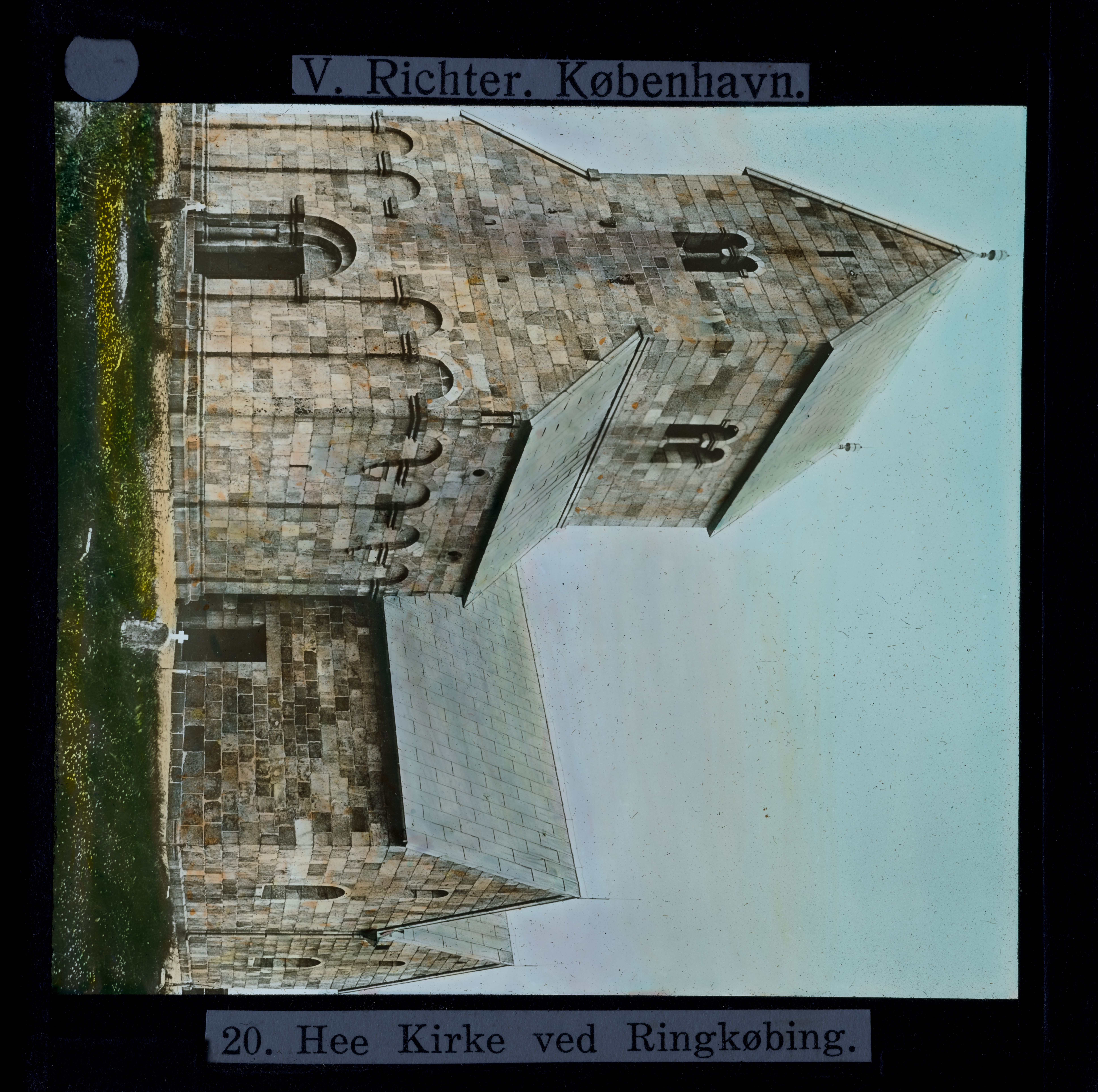 Billedet er håndkoloreret og stammer fra lysbilledserie nr. 247 benævnt "Danske Landsbykirker". På dias er påsat labels: "V. Richter. København." og "20. Hee Kirke ved Ringkøbing". I serien er 53 lysbilleder. Firmaet V. Richter producerede, kuraterede og distribuerede lysbilledserier i primært 1920'erne og 1930'erne. Dias måler ca. 8 x 8 cm.