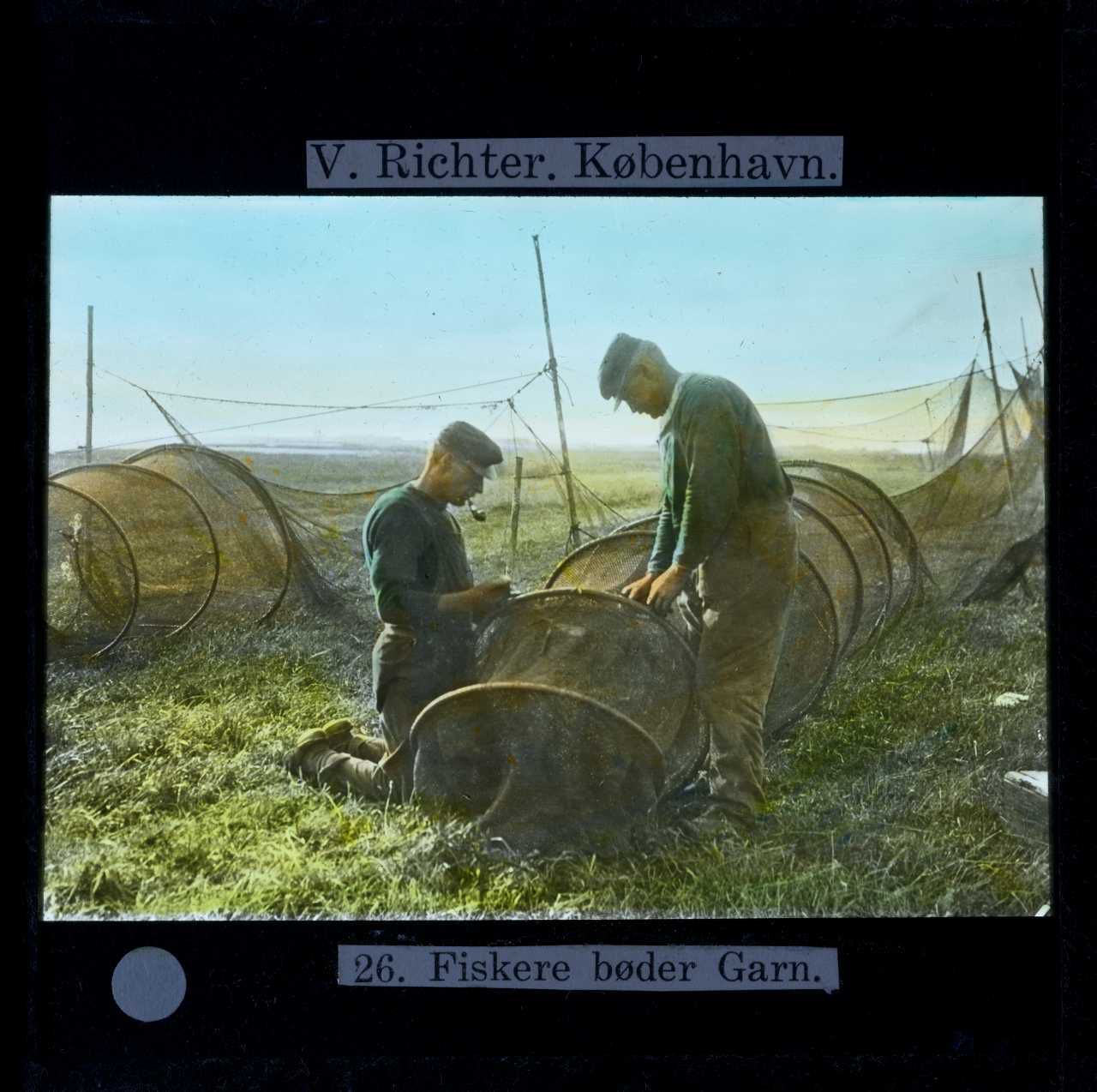 Titel hentet fra original dias. Billedet er håndkoloreret og stammer fra lysbilledserie nr. 248 benævnt "Vestjylland". På dias er påsat labels: "V. Richter. København." og "26. Fiskere bøder Garn.". I serien er 59 lysbilleder. Firmaet V. Richter producerede, kuraterede og distribuerede lysbilledserier i primært 1920'erne og 1930'erne. Dias måler ca. 8 x 8 cm.