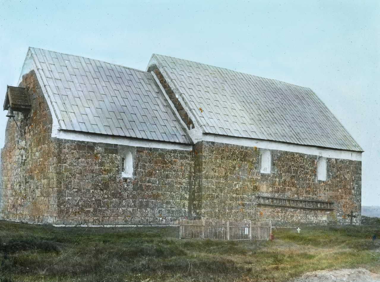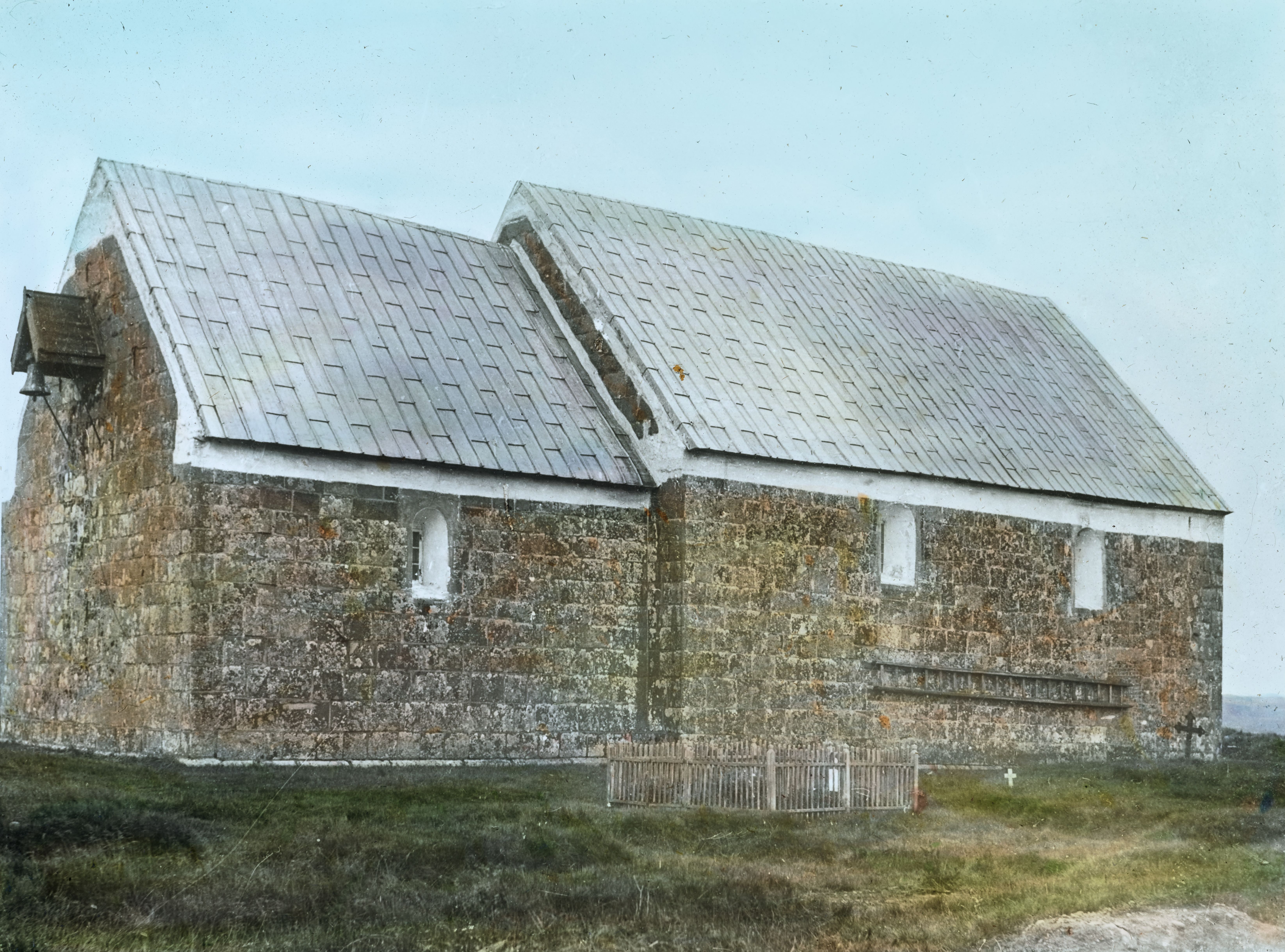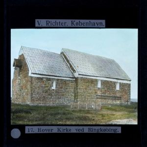 Billedet er håndkoloreret og stammer fra lysbilledserie nr. 247 benævnt "Danske Landsbykirker". På dias er påsat labels: "V. Richter. København." og "17. Hover Kirke ved Ringkøbing.". I serien er 53 lysbilleder. Firmaet V. Richter producerede, kuraterede og distribuerede lysbilledserier i primært 1920'erne og 1930'erne. Dias måler ca. 8 x 8 cm.