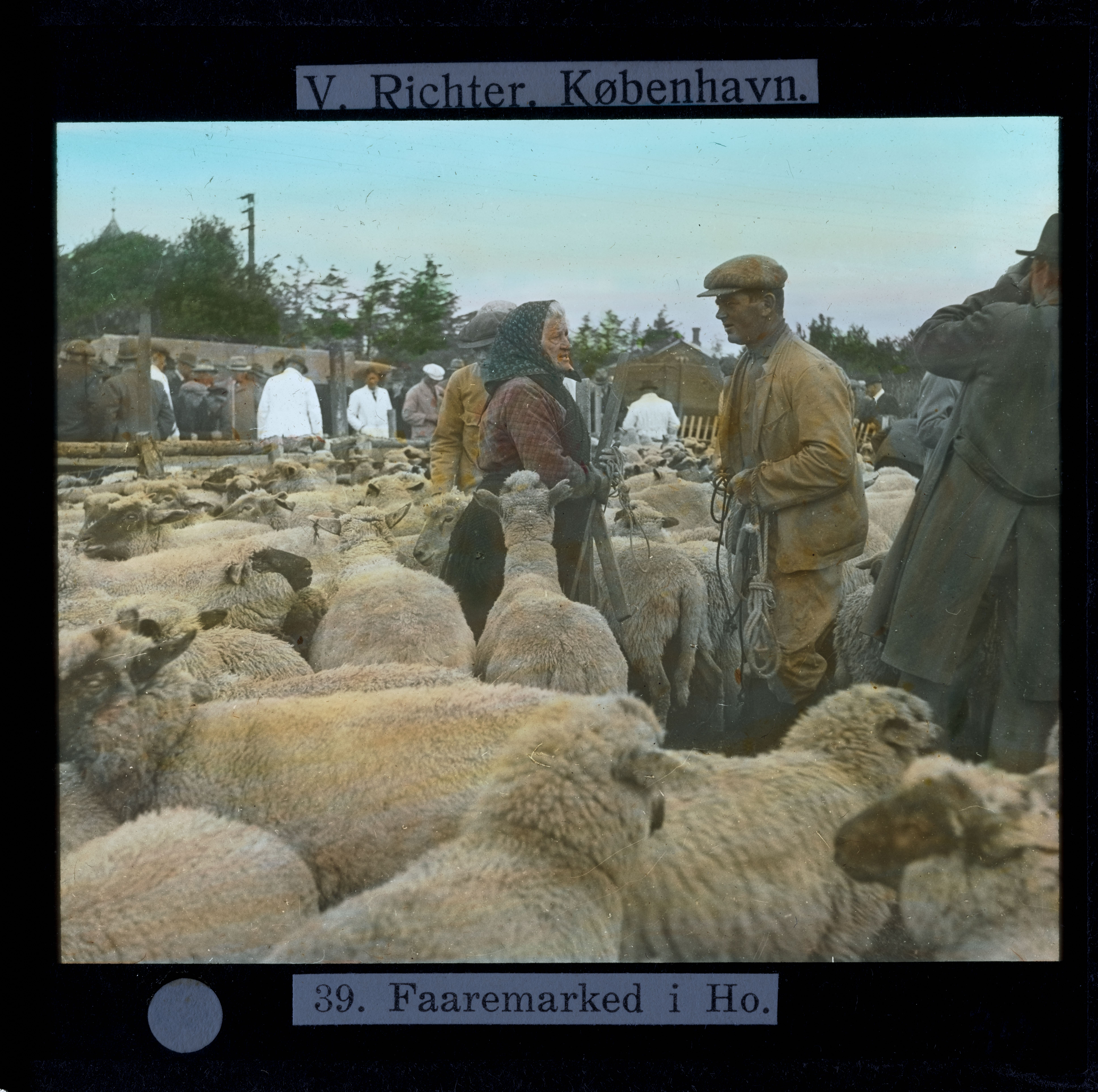 Titel hentet fra original dias. Billedet er håndkoloreret og stammer fra lysbilledserie nr. 248 benævnt "Vestjylland". På dias er påsat labels: "V. Richter. København." og "39. Faaremarked i Ho.". I serien er 59 lysbilleder. Firmaet V. Richter producerede, kuraterede og distribuerede lysbilledserier i primært 1920'erne og 1930'erne. Dias måler ca. 8 x 8 cm.