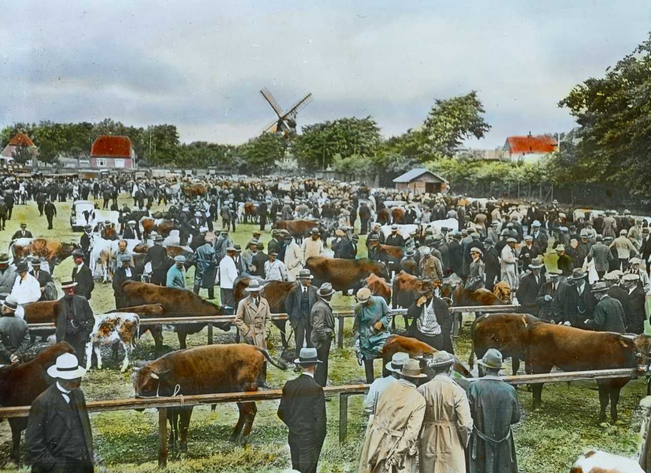Titel hentet fra original dias. Billedet er håndkoloreret og stammer fra lysbilledserie nr. 248 benævnt "Vestjylland". På dias er påsat labels: "V. Richter. København." og "42. Marked i Varde.". I serien er 59 lysbilleder. Firmaet V. Richter producerede, kuraterede og distribuerede lysbilledserier i primært 1920'erne og 1930'erne. Dias måler ca. 8 x 8 cm.