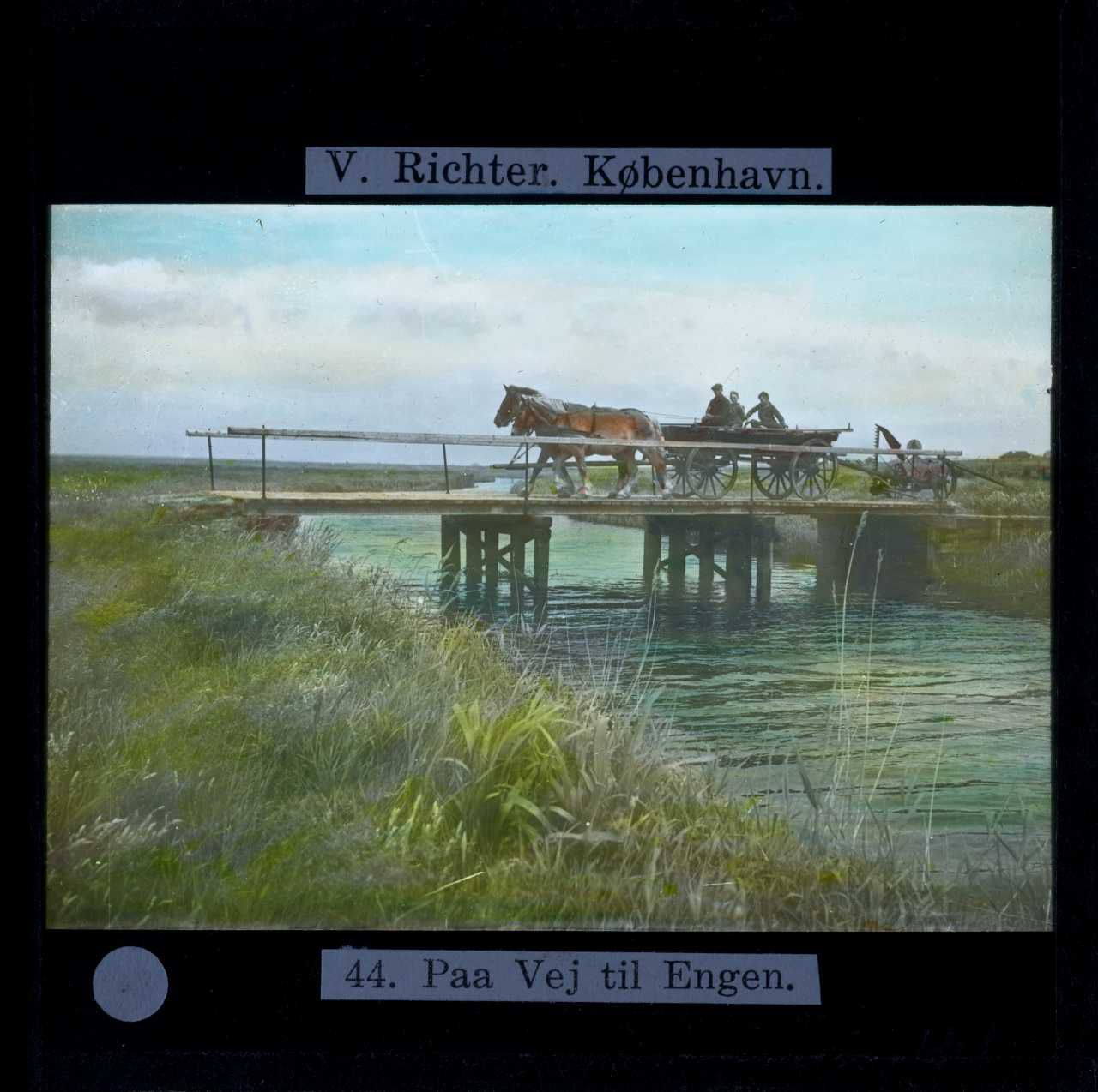 Titel hentet fra original dias. Billedet er håndkoloreret og stammer fra lysbilledserie nr. 248 benævnt "Vestjylland". På dias er påsat labels: "V. Richter. København." og "44. Paa Vej til Engen.". I serien er 59 lysbilleder. Firmaet V. Richter producerede, kuraterede og distribuerede lysbilledserier i primært 1920'erne og 1930'erne. Dias måler ca. 8 x 8 cm.