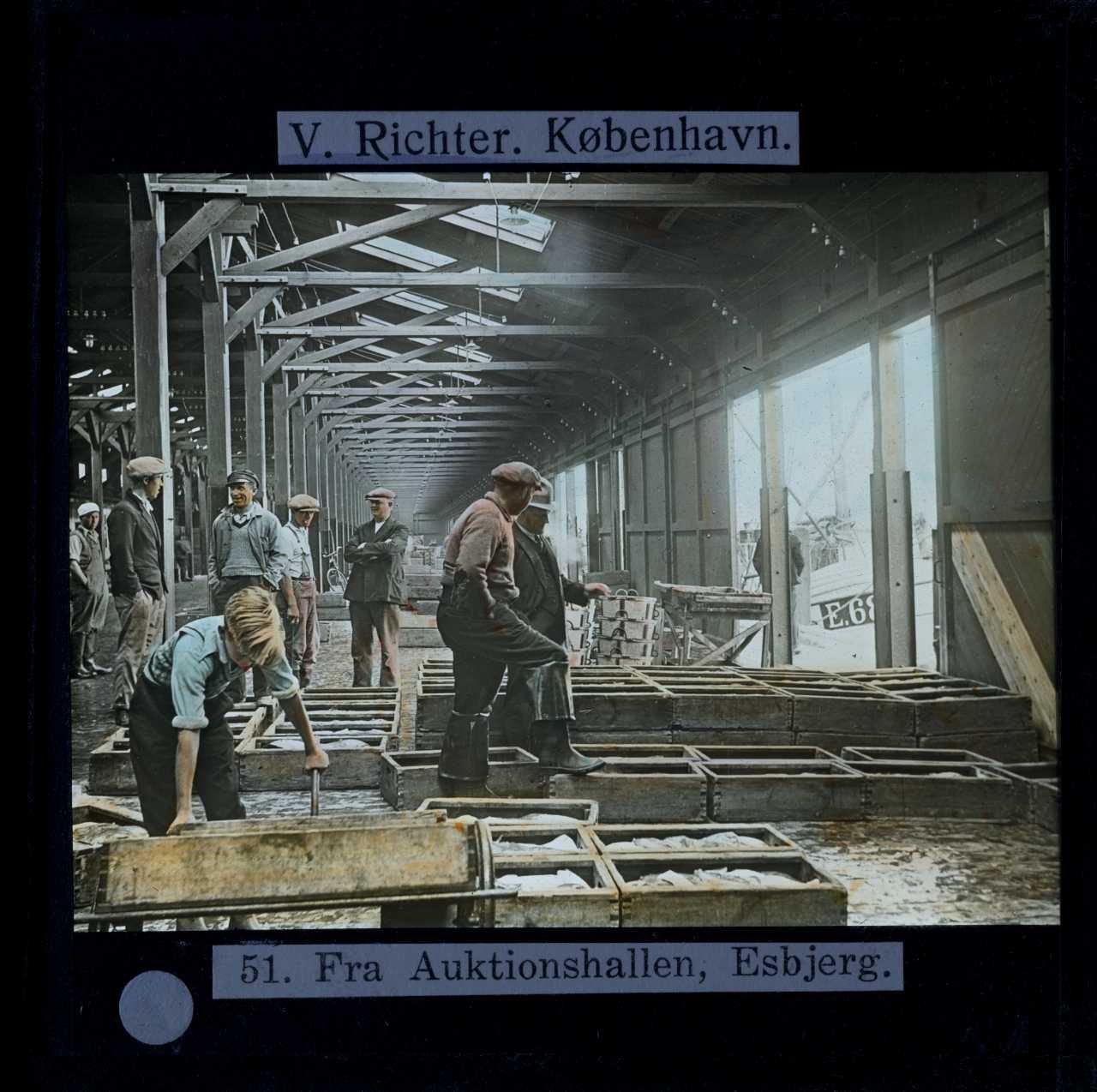 Billedet er håndkoloreret og stammer fra lysbilledserie nr. 248 benævnt "Vestjylland". På dias er påsat labels: "V. Richter. København." og "51. Fra Auktionshallen, Esbjerg.". I serien er 59 lysbilleder. Firmaet V. Richter producerede, kuraterede og distribuerede lysbilledserier i primært 1920'erne og 1930'erne. Dias måler ca. 8 x 8 cm.