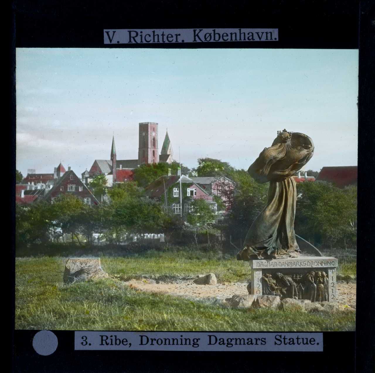 Billedet er håndkoloreret og stammer fra lysbilledserie nr. 259 benævnt "Vort land". På dias er påsat labels: "V. Richter. København." og "3. Ribe, Dronning Dagmars Statue.". I serien er 69 lysbilleder. Firmaet V. Richter producerede, kuraterede og distribuerede lysbilledserier i primært 1920'erne og 1930'erne. Dias måler ca. 8 x 8 cm.