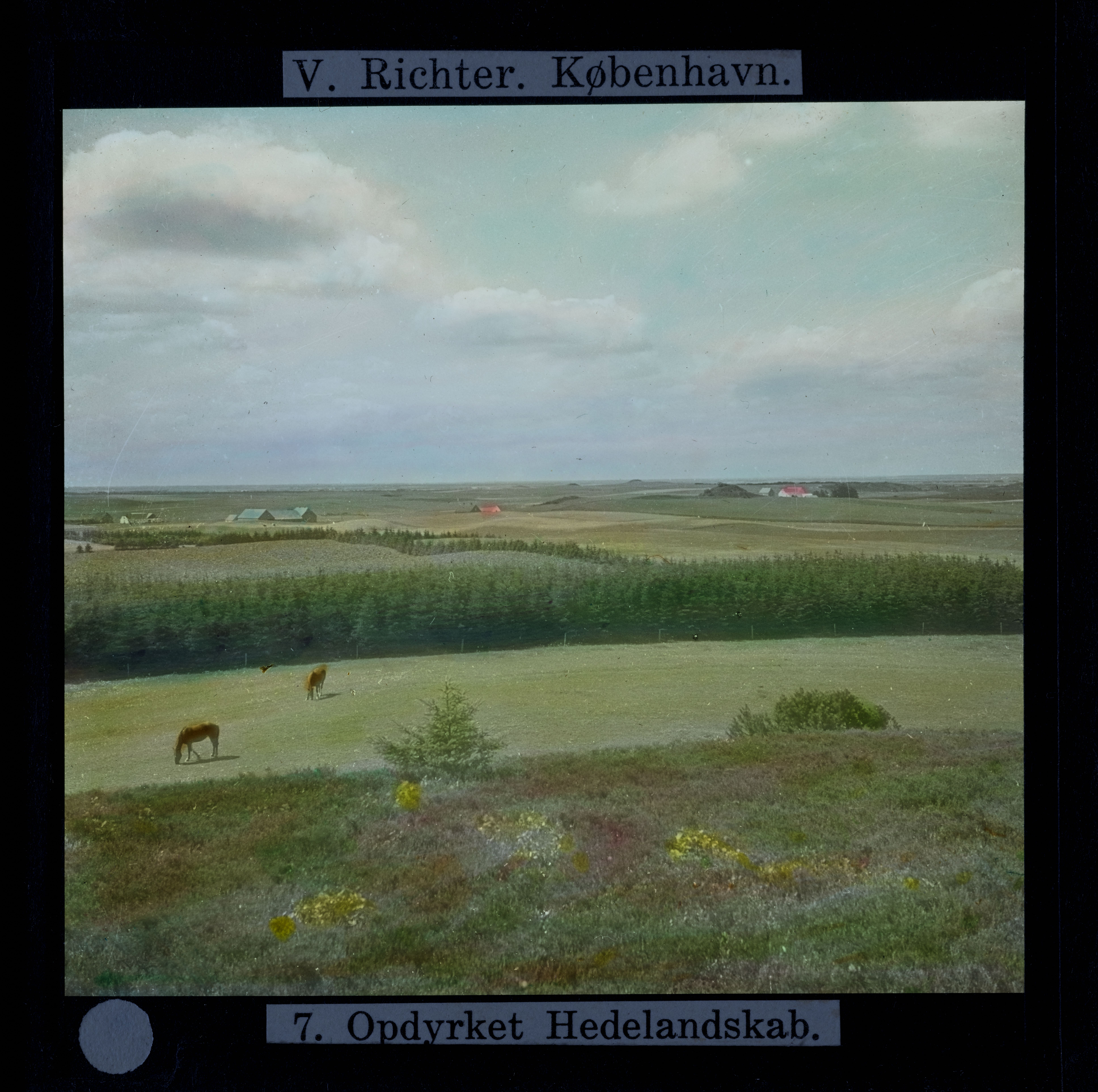 Titel hentet fra original dias. Billedet er håndkoloreret og stammer fra lysbilledserie nr. 259 benævnt "Vort land". På dias er påsat labels: "V. Richter. København." og "7. Opdyrket Hedelandskab.". I serien er 69 lysbilleder. Firmaet V. Richter producerede, kuraterede og distribuerede lysbilledserier i primært 1920'erne og 1930'erne. Dias måler ca. 8 x 8 cm.