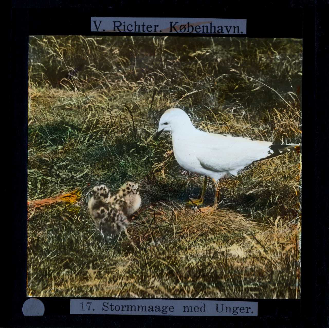Billedet er håndkoloreret og stammer fra lysbilledserie nr. 248 benævnt "Vestjylland". På dias er påsat labels: "V. Richter. København." og "17. Stormmaage med Unger.". I serien er 59 lysbilleder. Firmaet V. Richter producerede, kuraterede og distribuerede lysbilledserier i primært 1920'erne og 1930'erne. Dias måler ca. 8 x 8 cm.