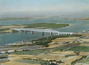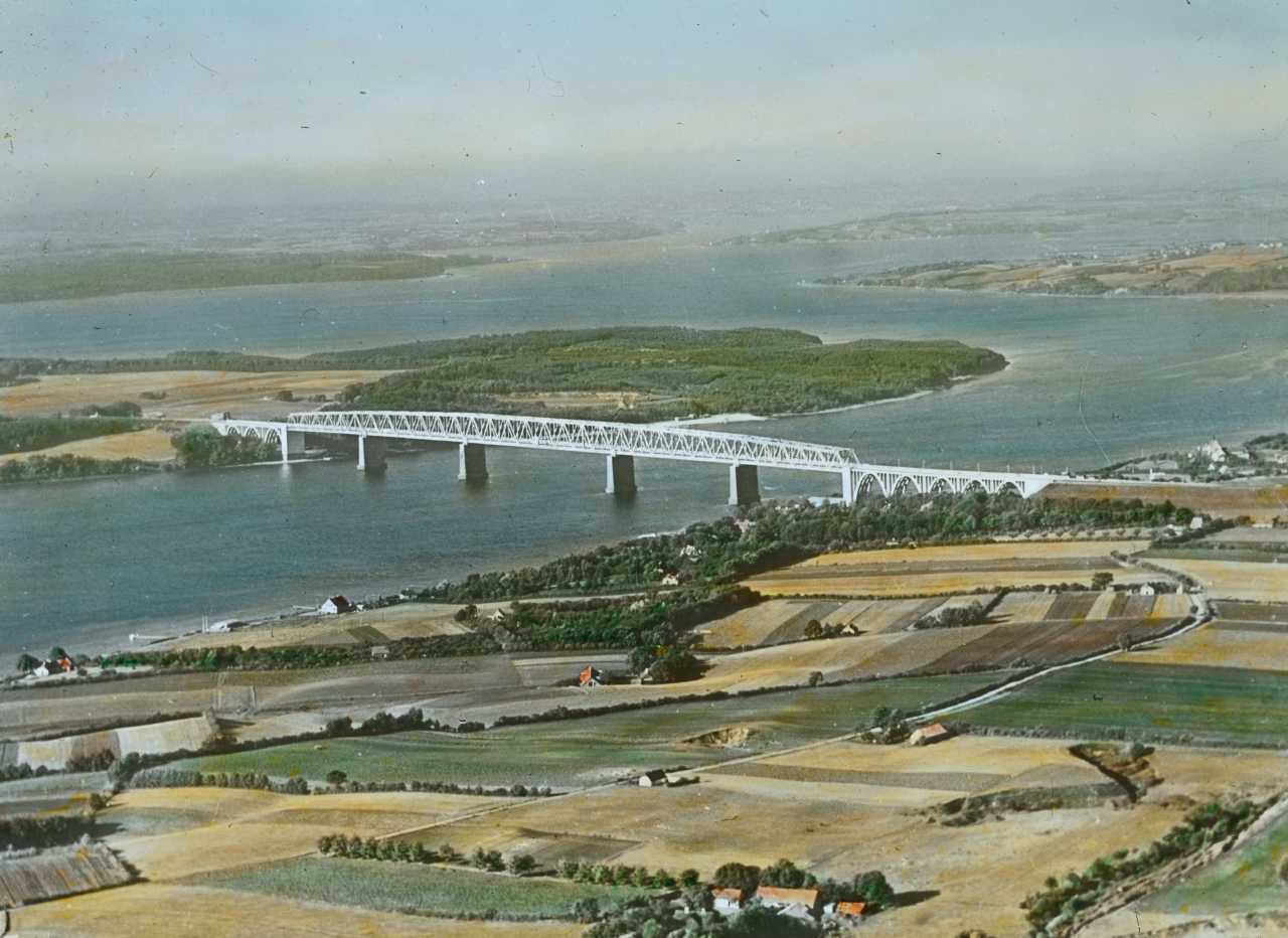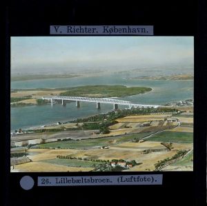 Titel hentet fra original dias. Billedet er håndkoloreret og stammer fra lysbilledserie nr. 257 benævnt "Vort land". På dias er påsat labels: "V. Richter. København." og "26. Lillebæltsbroen. (Luftfoto).". I serien er 70 lysbilleder. Firmaet V. Richter producerede, kuraterede og distribuerede lysbilledserier i primært 1920'erne og 1930'erne. Dias måler ca. 8 x 8 cm.