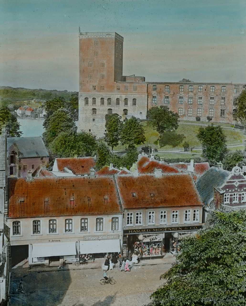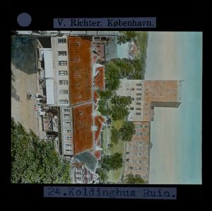 Billedet er håndkoloreret og stammer fra lysbilledserie nr. 259 benævnt "Vort land". På dias er påsat labels: "V. Richter. København." og "24. Koldinghus Ruin.". I serien er 69 lysbilleder. Firmaet V. Richter producerede, kuraterede og distribuerede lysbilledserier i primært 1920'erne og 1930'erne. Dias måler ca. 8 x 8 cm.