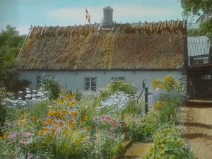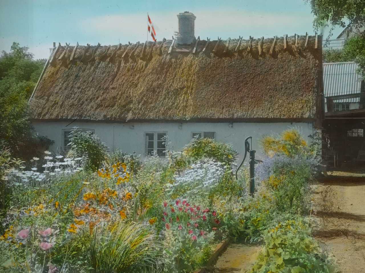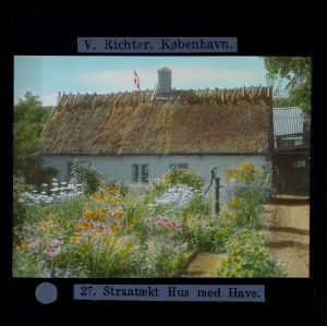 Titel hentet fra original dias. Billedet er håndkoloreret og stammer fra lysbilledserie nr. 259 benævnt "Vort land". På dias er påsat labels: "V. Richter. København." og "27. Straatækt Hus med Have.". I serien er 69 lysbilleder. Firmaet V. Richter producerede, kuraterede og distribuerede lysbilledserier i primært 1920'erne og 1930'erne. Dias måler ca. 8 x 8 cm.