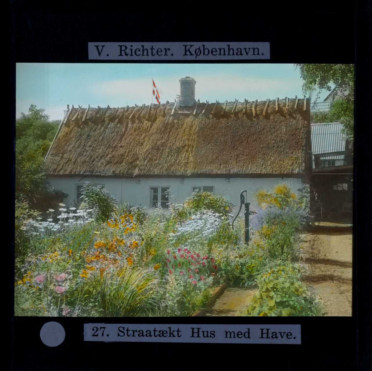 Titel hentet fra original dias. Billedet er håndkoloreret og stammer fra lysbilledserie nr. 259 benævnt "Vort land". På dias er påsat labels: "V. Richter. København." og "27. Straatækt Hus med Have.". I serien er 69 lysbilleder. Firmaet V. Richter producerede, kuraterede og distribuerede lysbilledserier i primært 1920'erne og 1930'erne. Dias måler ca. 8 x 8 cm.