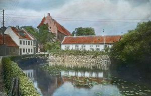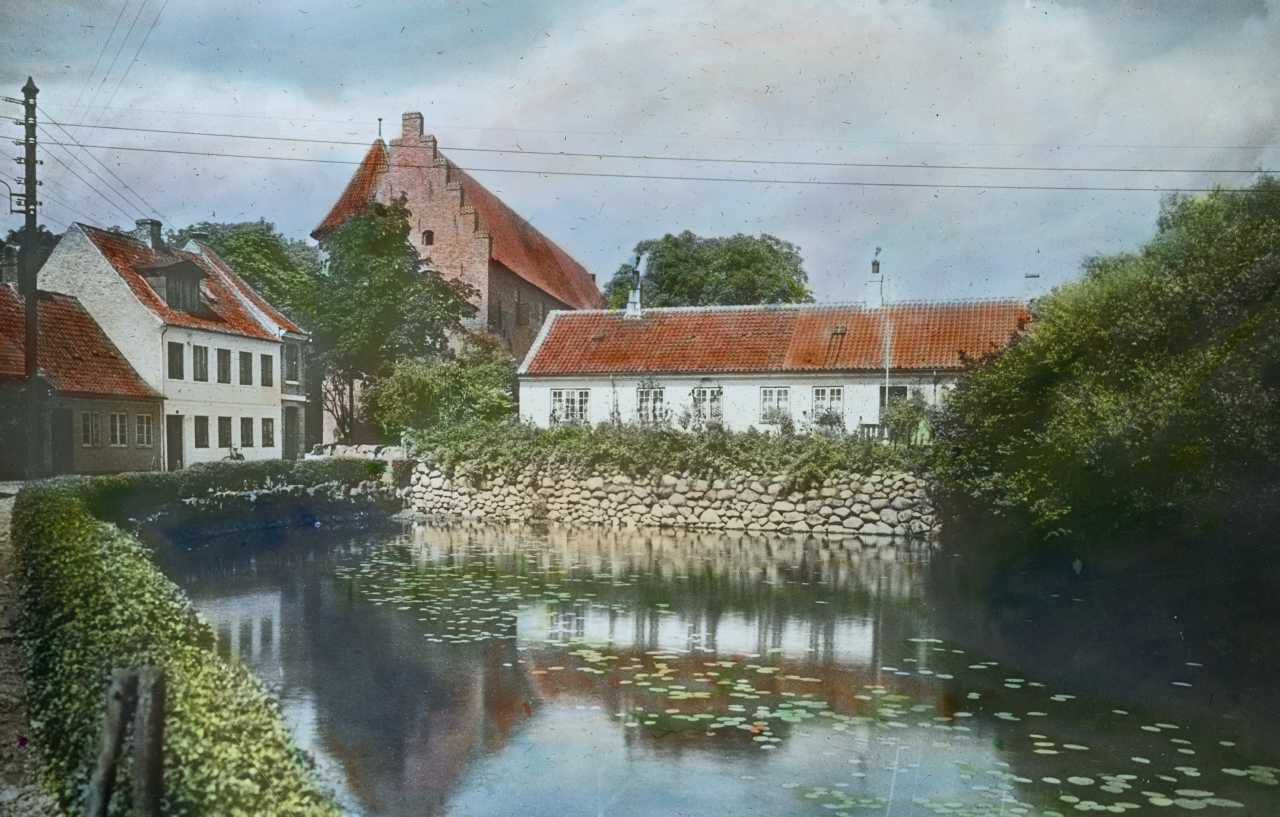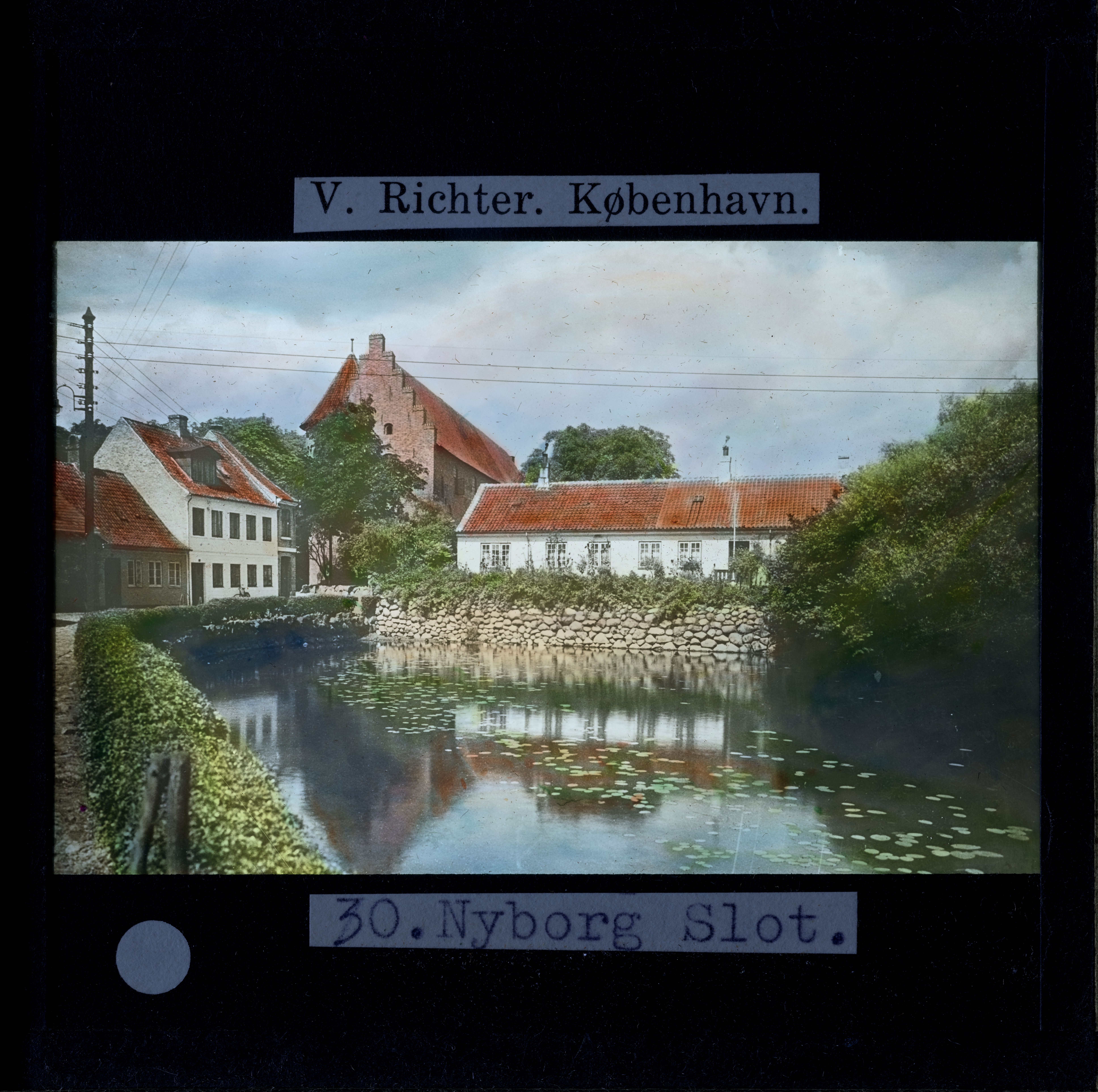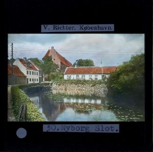 Titel hentet fra original dias. Billedet er håndkoloreret og stammer fra lysbilledserie nr. 259 benævnt "Vort land". På dias er påsat labels: "V. Richter. København." og "30. Nyborg Slot.". I serien er 69 lysbilleder. Firmaet V. Richter producerede, kuraterede og distribuerede lysbilledserier i primært 1920'erne og 1930'erne. Dias måler ca. 8 x 8 cm.