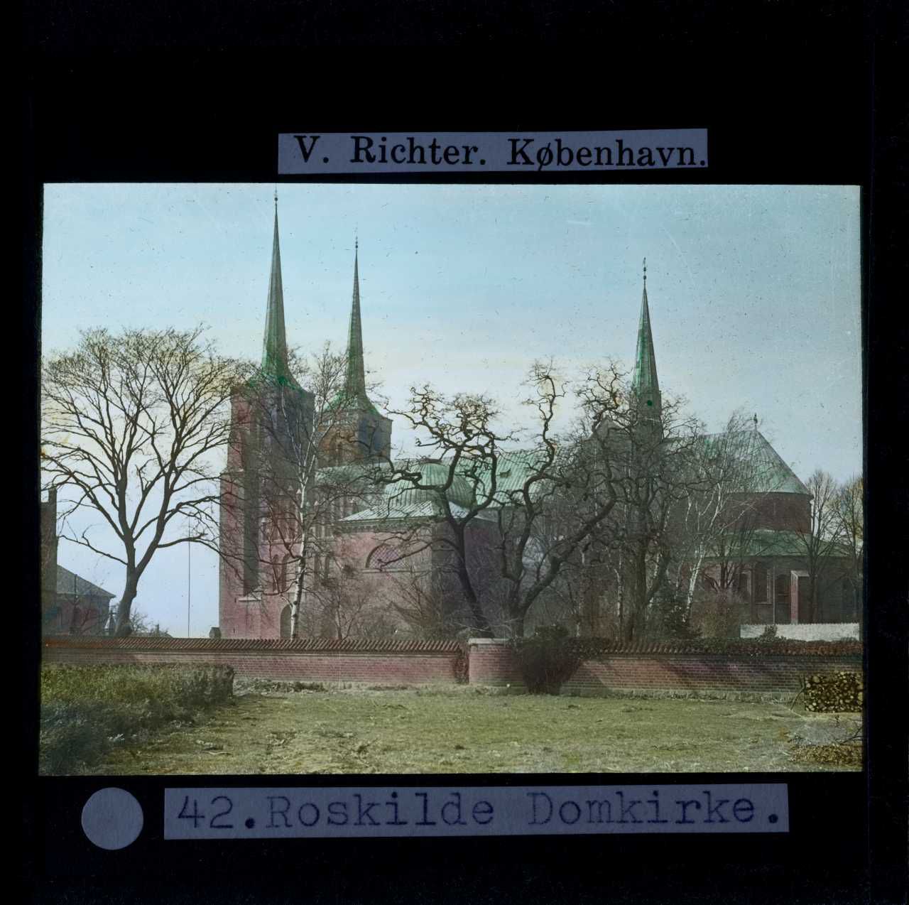 Titel hentet fra original dias. Billedet er håndkoloreret og stammer fra lysbilledserie nr. 259 benævnt "Vort land". På dias er påsat labels: "V. Richter. København." og "42. Roskilde Domkirke.". I serien er 69 lysbilleder. Firmaet V. Richter producerede, kuraterede og distribuerede lysbilledserier i primært 1920'erne og 1930'erne. Dias måler ca. 8 x 8 cm.