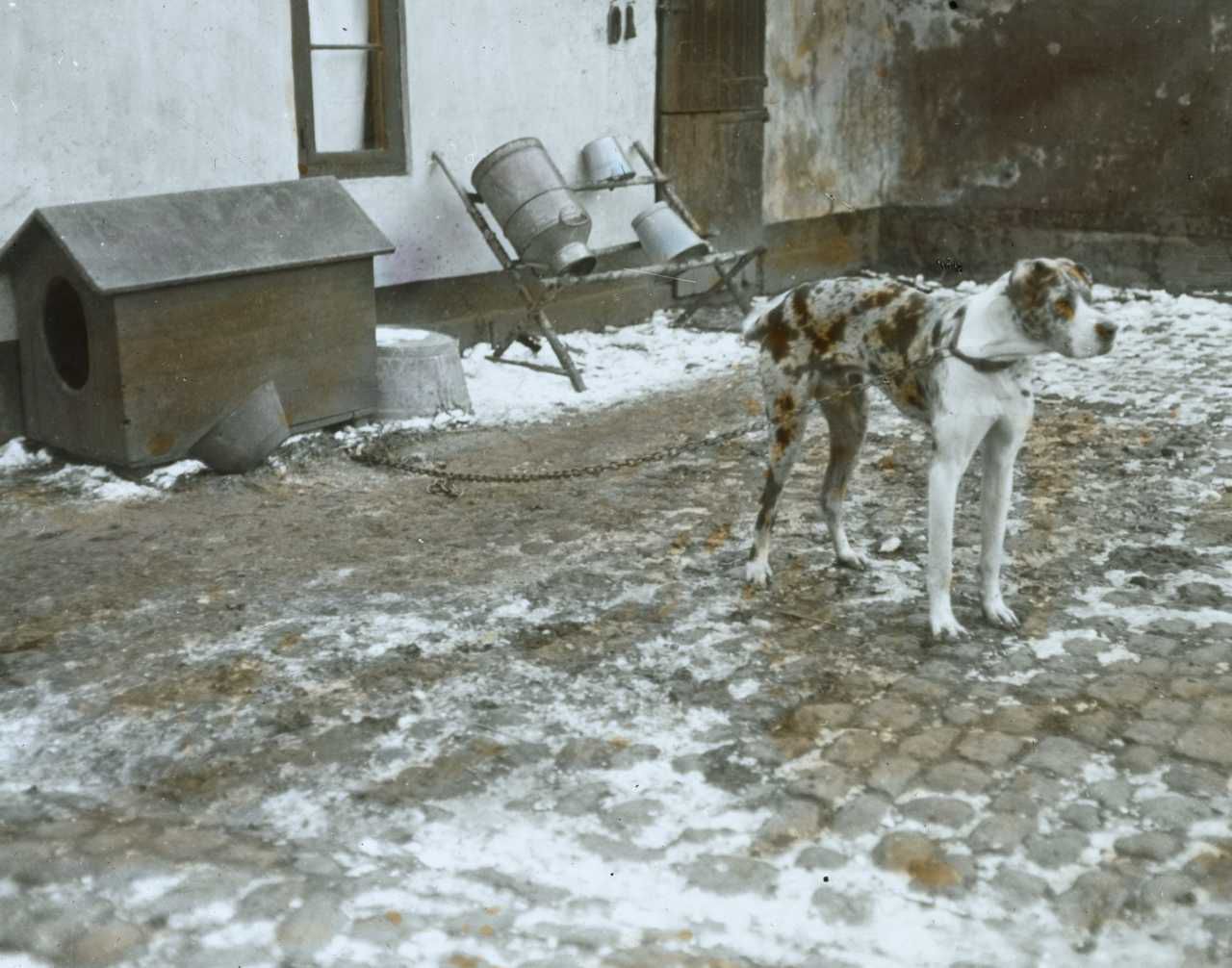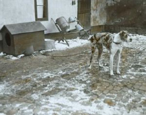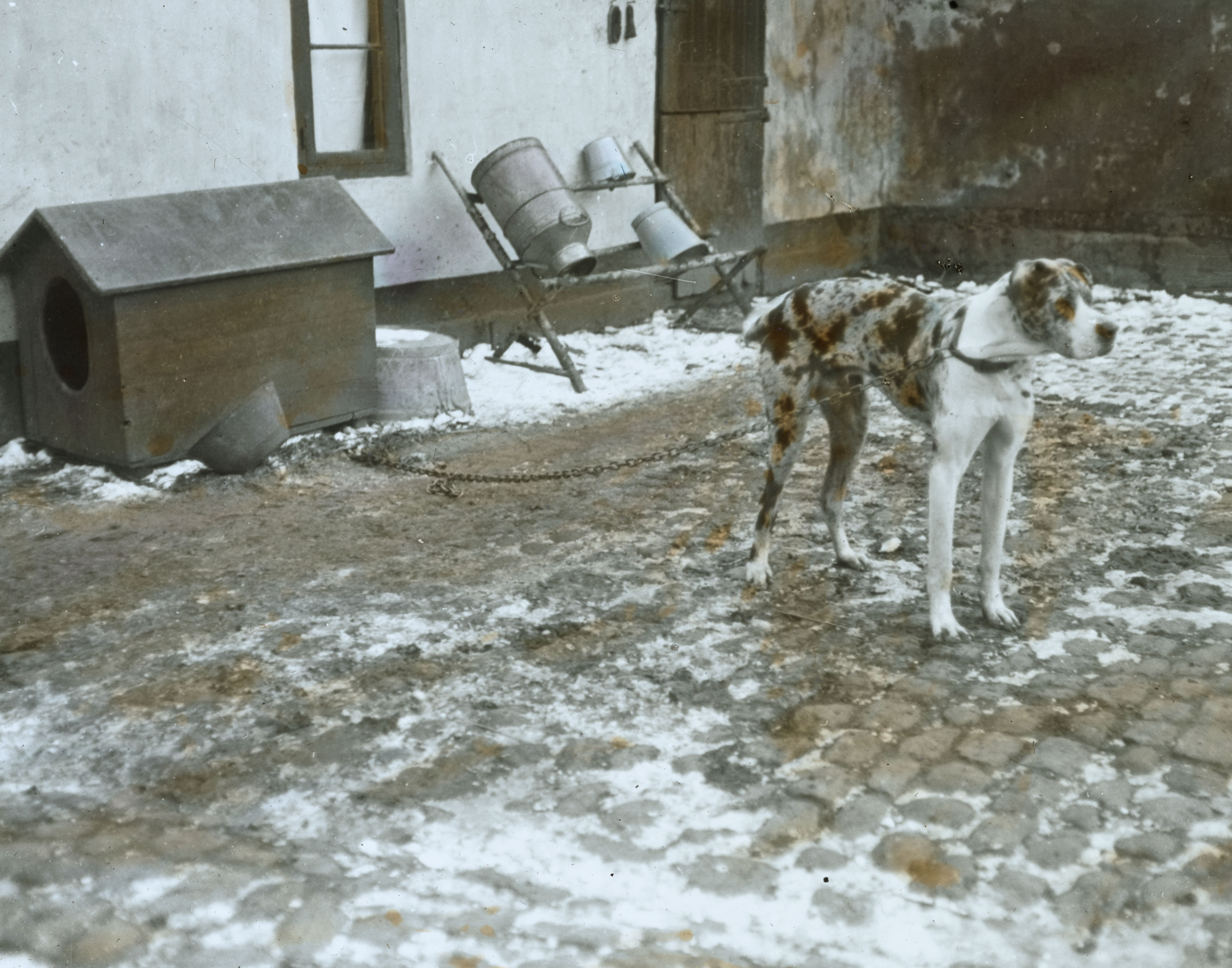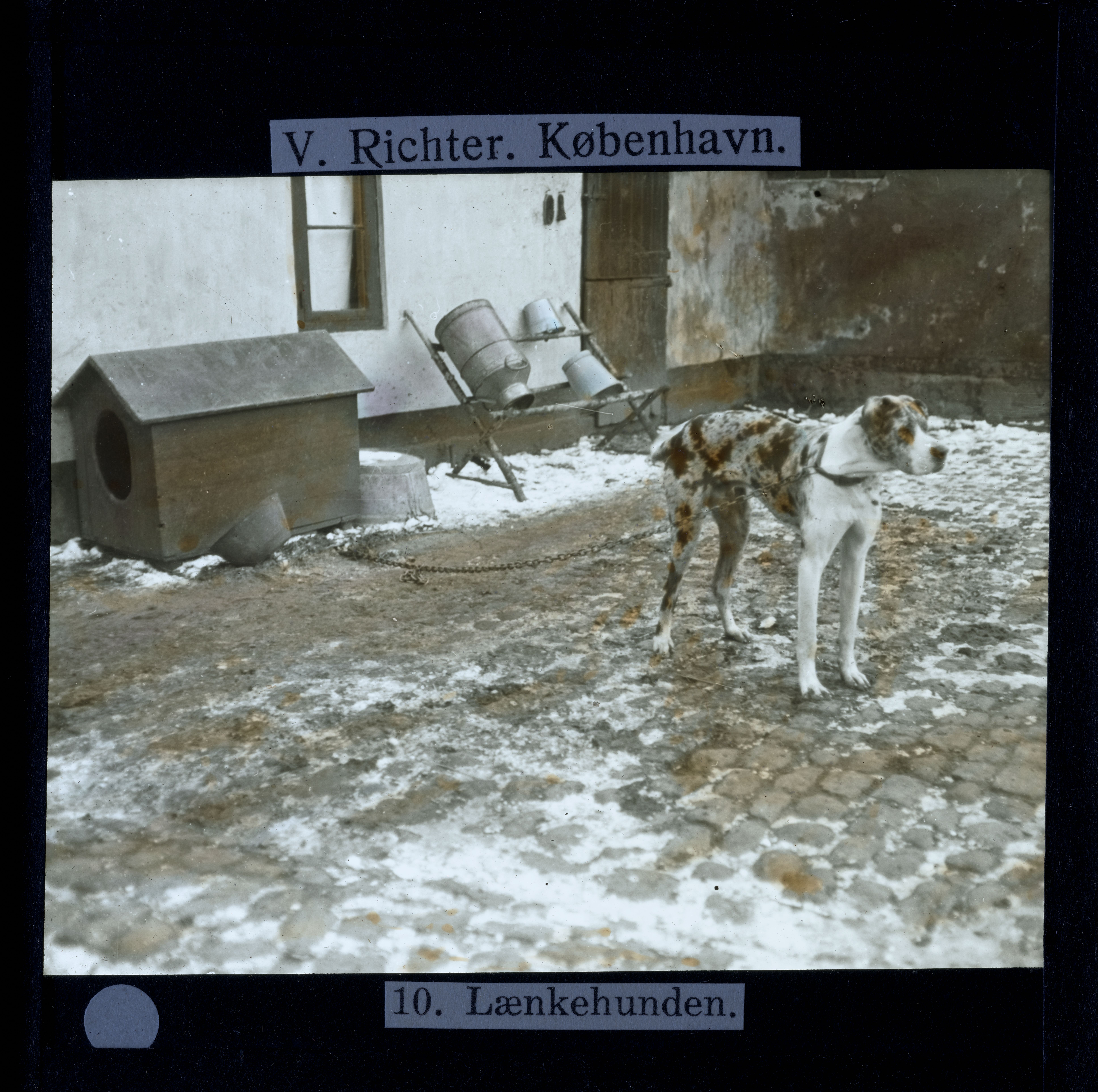 Titel hentet fra original dias. Billedet er håndkoloreret og stammer fra lysbilledserie nr. 260 benævnt "Ved Vintertid i Danmark". På dias er påsat labels: "V. Richter. København." og "10. Lænkehunden.". I serien er 59 lysbilleder. Firmaet V. Richter producerede, kuraterede og distribuerede lysbilledserier i primært 1920'erne og 1930'erne. Dias måler ca. 8 x 8 cm.