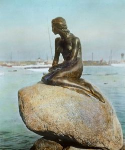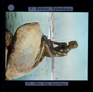 Titel hentet fra original dias. Billedet er håndkoloreret og stammer fra lysbilledserie nr. 257 benævnt "Vort land". På dias er påsat labels: "V. Richter. København." og "57. »Den lille Havfrue«.". I serien er 70 lysbilleder. Firmaet V. Richter producerede, kuraterede og distribuerede lysbilledserier i primært 1920'erne og 1930'erne. Dias måler ca. 8 x 8 cm.