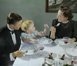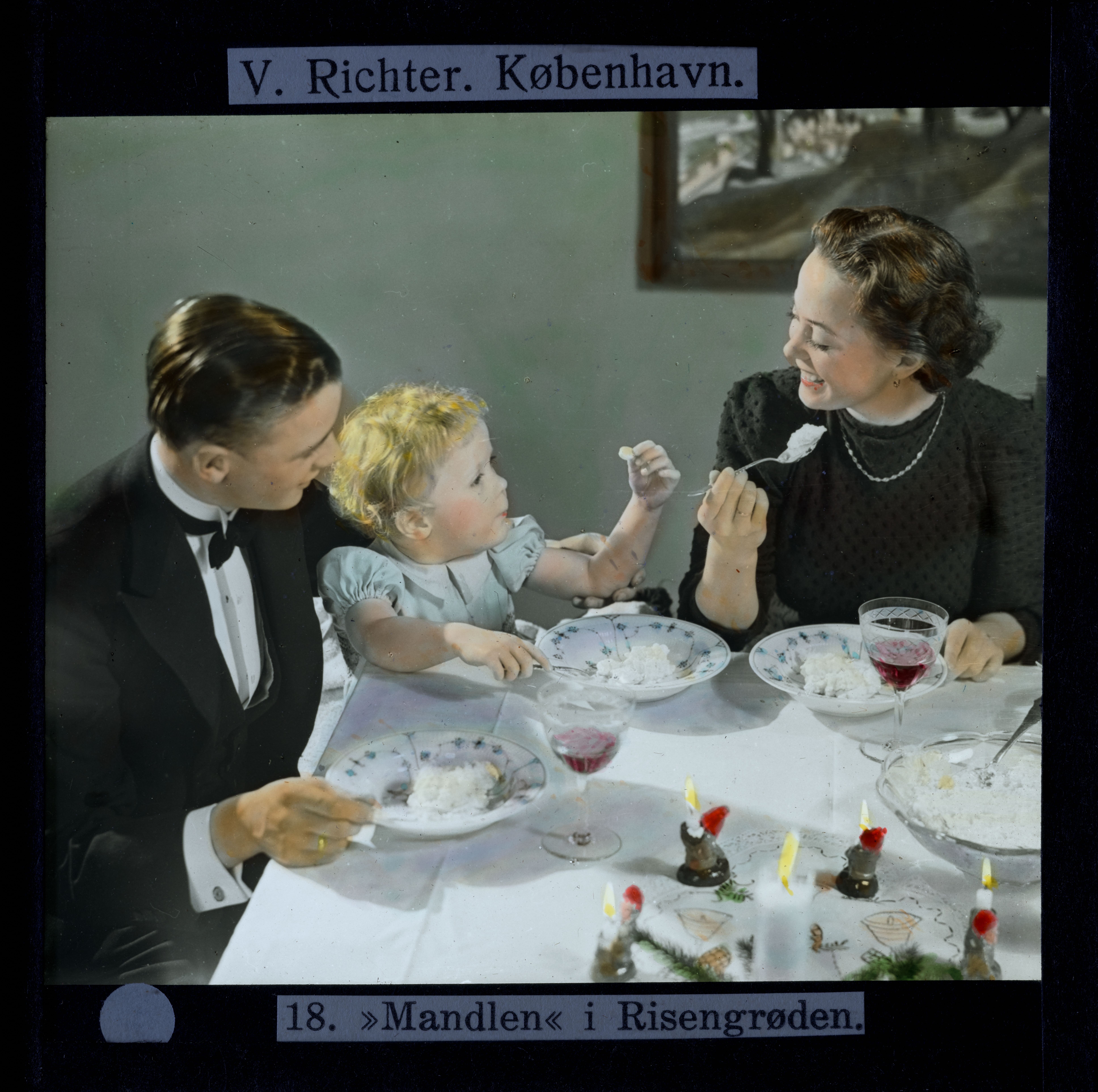 Titel hentet fra original dias. Billedet er håndkoloreret og stammer fra lysbilledserie nr. 260 benævnt "Ved Vintertid i Danmark". På dias er påsat labels: "V. Richter. København." og "18. »Mandlen« i Risengrøden.". I serien er 59 lysbilleder. Firmaet V. Richter producerede, kuraterede og distribuerede lysbilledserier i primært 1920'erne og 1930'erne. Dias måler ca. 8 x 8 cm.