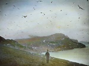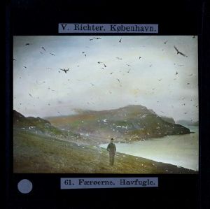 Billedet er håndkoloreret og stammer fra lysbilledserie nr. 257 benævnt "Vort land". På dias er påsat labels: "V. Richter. København." og "61. Færøerne. Havfugle.". I serien er 70 lysbilleder. Firmaet V. Richter producerede, kuraterede og distribuerede lysbilledserier i primært 1920'erne og 1930'erne. Dias måler ca. 8 x 8 cm.
