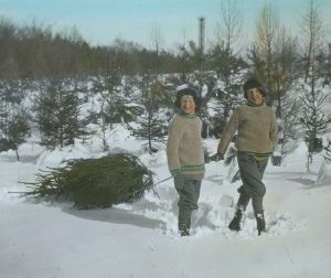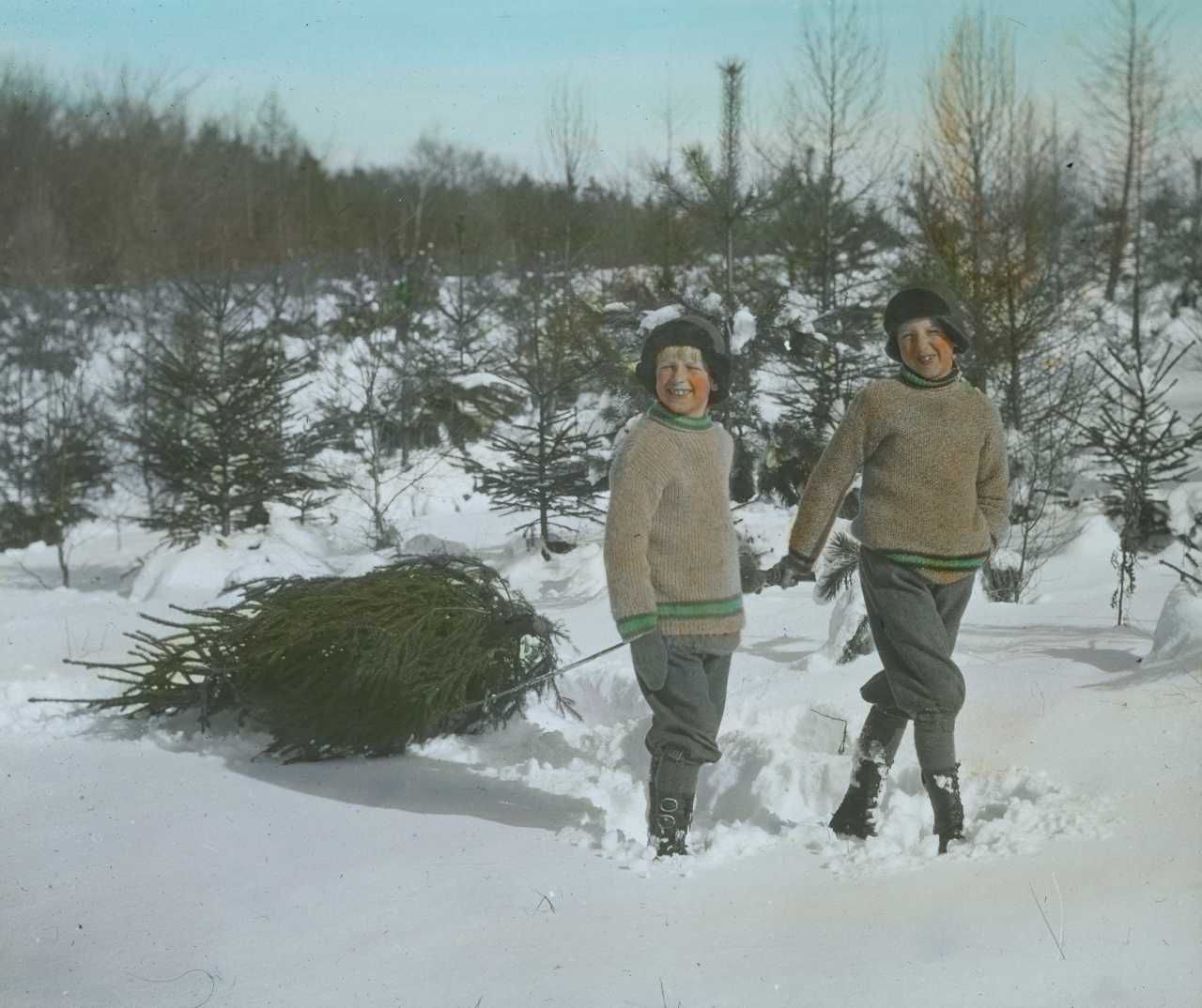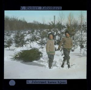 Titel hentet fra original dias. Billedet er håndkoloreret og stammer fra lysbilledserie nr. 260 benævnt "Ved Vintertid i Danmark". På dias er påsat labels: "V. Richter. København." og "5. Juletræet køres hjem.". I serien er 59 lysbilleder. Firmaet V. Richter producerede, kuraterede og distribuerede lysbilledserier i primært 1920'erne og 1930'erne. Dias måler ca. 8 x 8 cm.