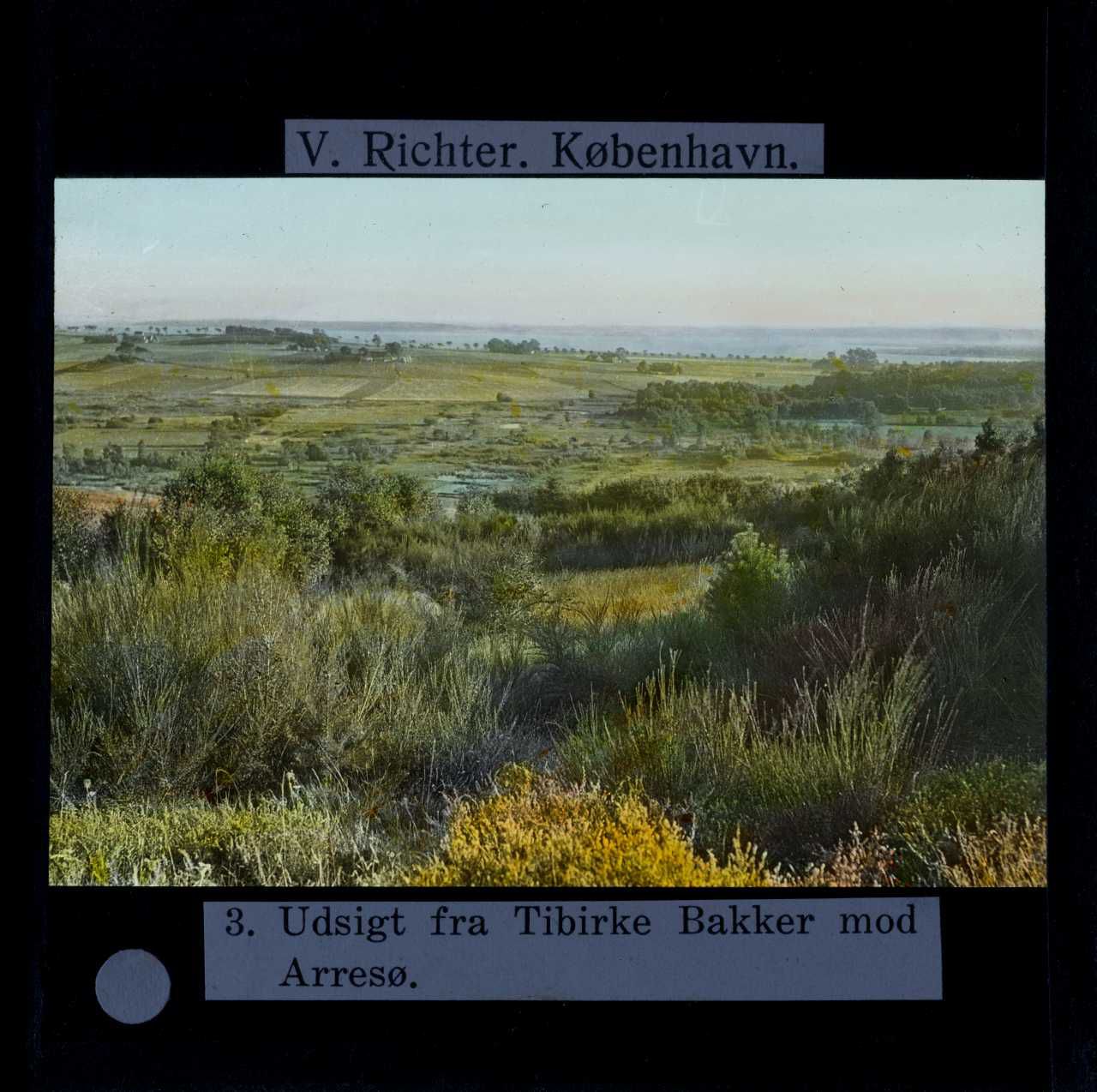 Titel hentet fra original dias. Billedet er håndkoloreret og stammer fra lysbilledserie nr. 272 benævnt "Sigvart Werners Danmark". På dias er påsat labels: "V. Richter. København." og "3. Udsigt fra Tibirke Bakker mod Arresø.". I serien er 41 lysbilleder. Firmaet V. Richter producerede, kuraterede og distribuerede lysbilledserier i primært 1920'erne og 1930'erne. Dias måler ca. 8 x 8 cm.