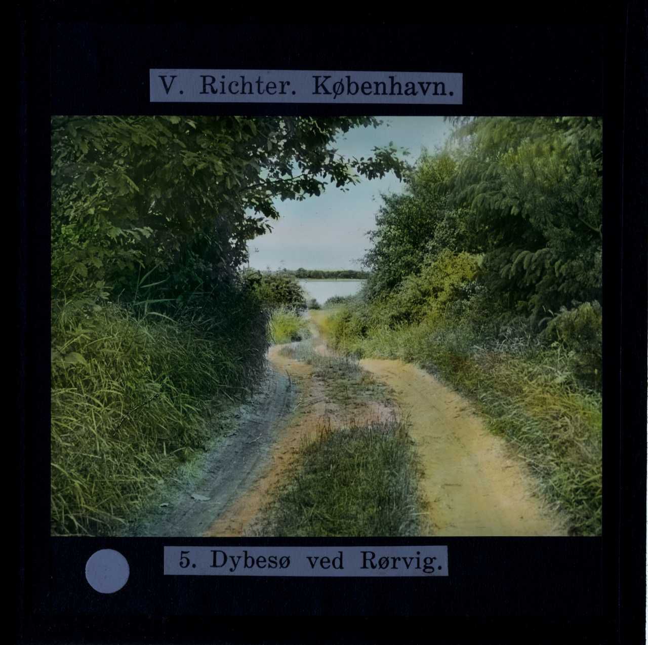 Titel hentet fra original dias. Billedet er håndkoloreret og stammer fra lysbilledserie nr. 272 benævnt "Sigvart Werners Danmark". På dias er påsat labels: "V. Richter. København." og "5. Dybesø ved Rørvig.". I serien er 41 lysbilleder. Firmaet V. Richter producerede, kuraterede og distribuerede lysbilledserier i primært 1920'erne og 1930'erne. Dias måler ca. 8 x 8 cm.