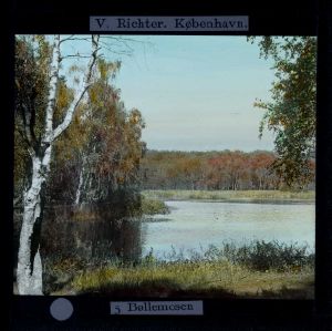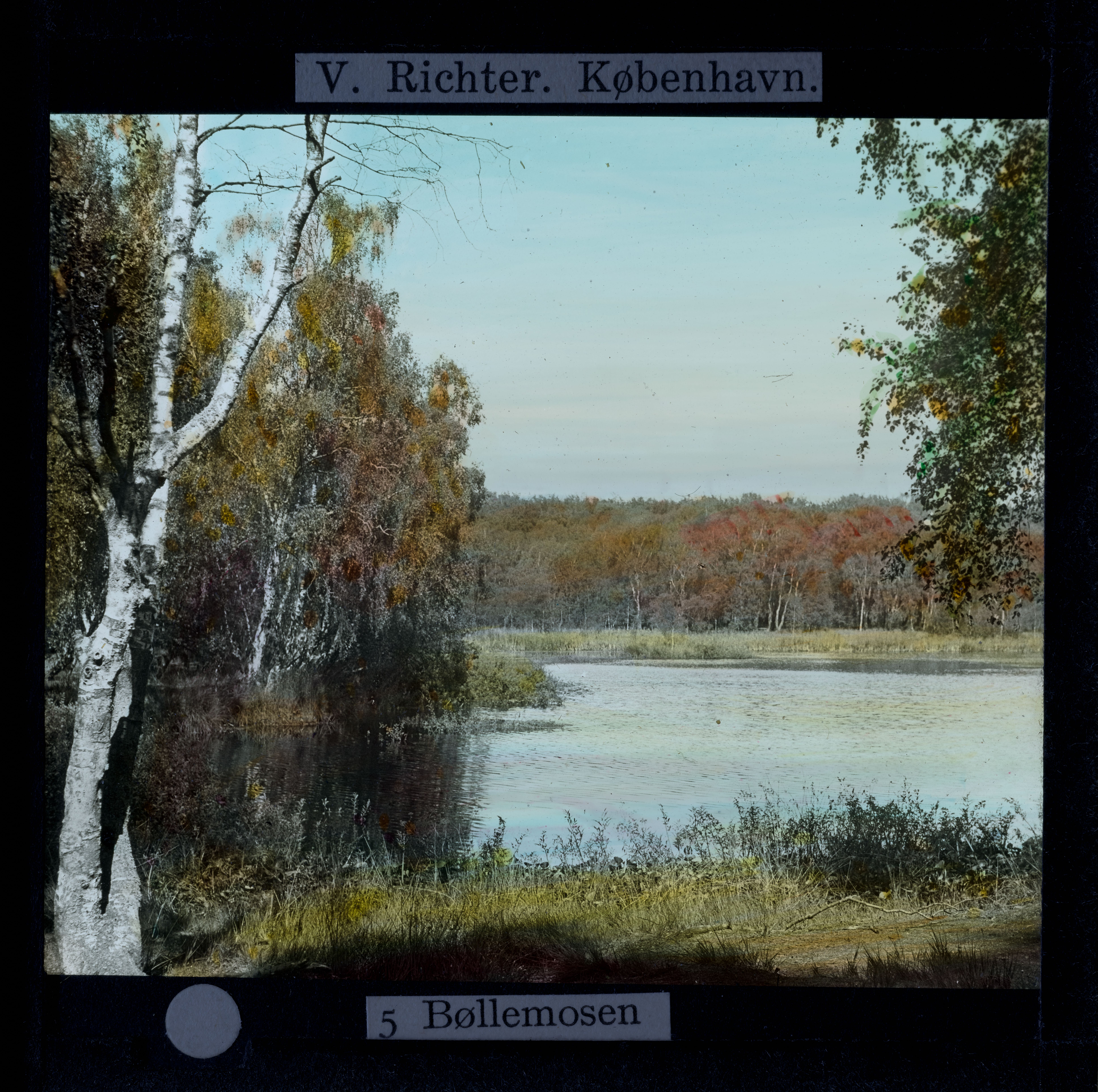 Billedet er håndkoloreret og stammer fra lysbilledserie nr. 273 benævnt "Jeg tror der er skønnest i Danmark". På dias er påsat labels: "V. Richter. København." og "5 Bøllemosen". I serien er 69 lysbilleder. Firmaet V. Richter producerede, kuraterede og distribuerede lysbilledserier i primært 1920'erne og 1930'erne. Dias måler ca. 8 x 8 cm.