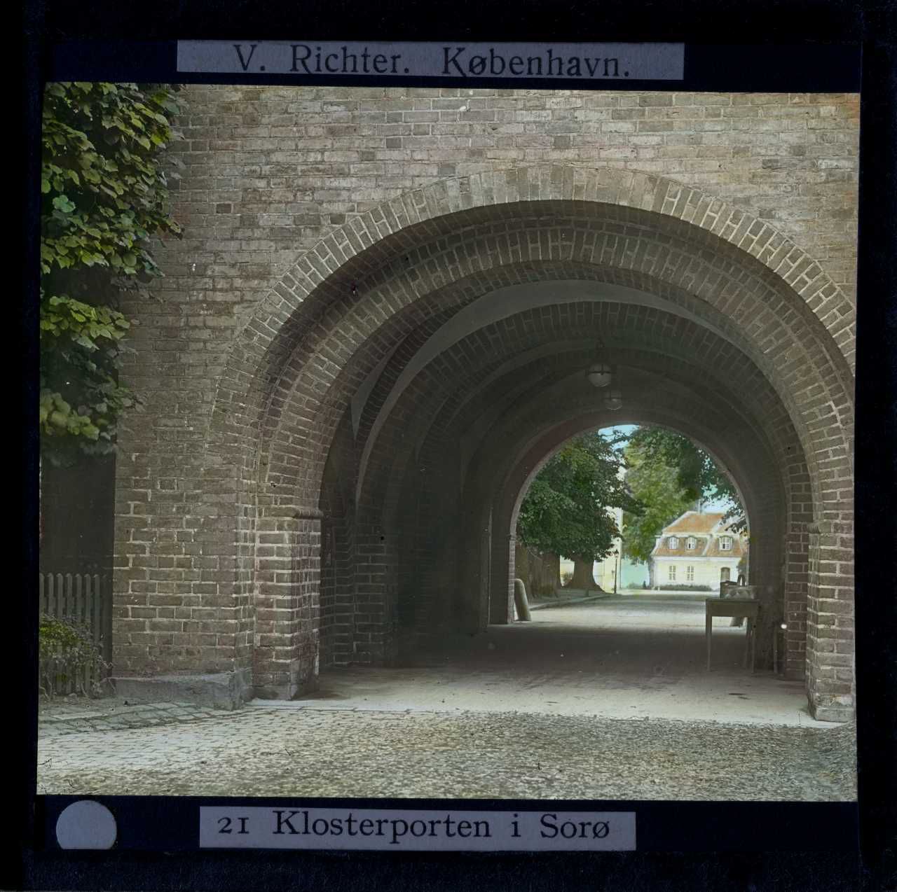Titel hentet fra original dias. Billedet er håndkoloreret og stammer fra lysbilledserie nr. 273 benævnt "Jeg tror der er skønnest i Danmark". På dias er påsat labels: "V. Richter. København." og "21 Klosterporten i Sorø". I serien er 69 lysbilleder. Firmaet V. Richter producerede, kuraterede og distribuerede lysbilledserier i primært 1920'erne og 1930'erne. Dias måler ca. 8 x 8 cm.