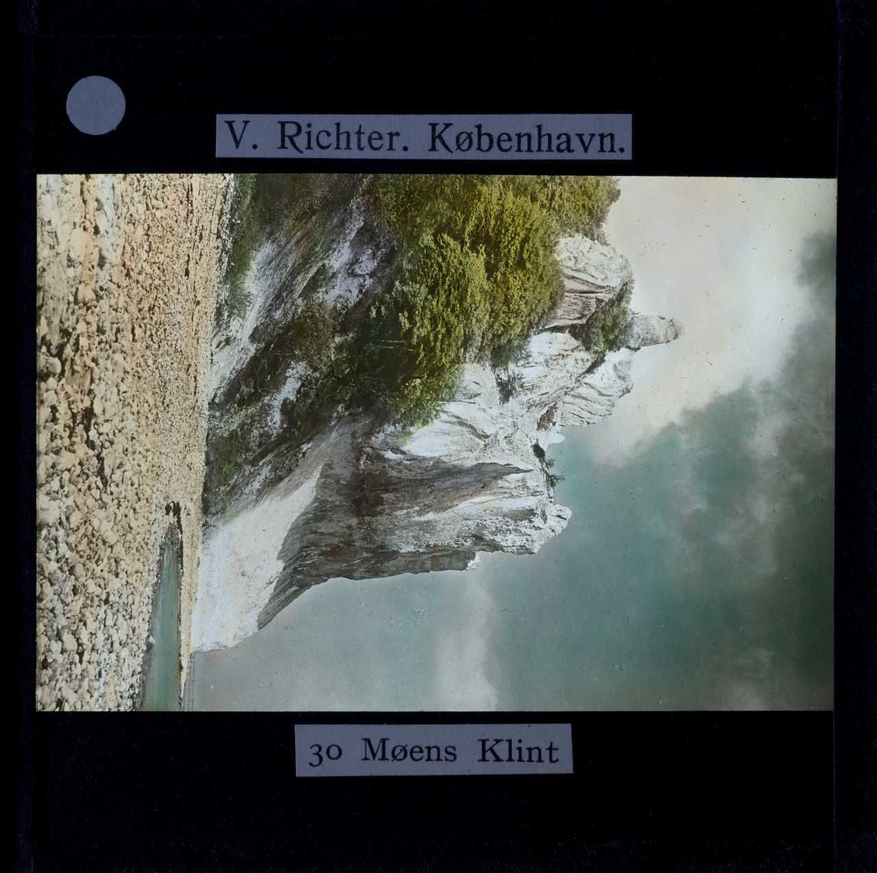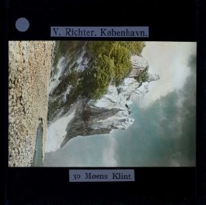 Billedet er håndkoloreret og stammer fra lysbilledserie nr. 273 benævnt "Jeg tror der er skønnest i Danmark". På dias er påsat labels: "V. Richter. København." og "30 Møens Klint". I serien er 69 lysbilleder. Firmaet V. Richter producerede, kuraterede og distribuerede lysbilledserier i primært 1920'erne og 1930'erne. Dias måler ca. 8 x 8 cm.