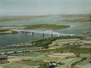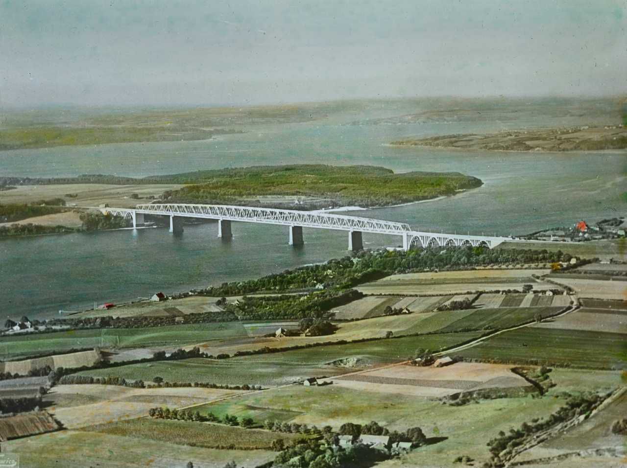 Billedet er håndkoloreret og stammer fra lysbilledserie nr. 279 benævnt "Sommer i Danmark". På dias er påsat labels: "V. Richter. København." og "2. Lillebæltsbroen. Luftfoto.". I serien er 40 lysbilleder. Firmaet V. Richter producerede, kuraterede og distribuerede lysbilledserier i primært 1920'erne og 1930'erne. Dias måler ca. 8 x 8 cm.