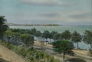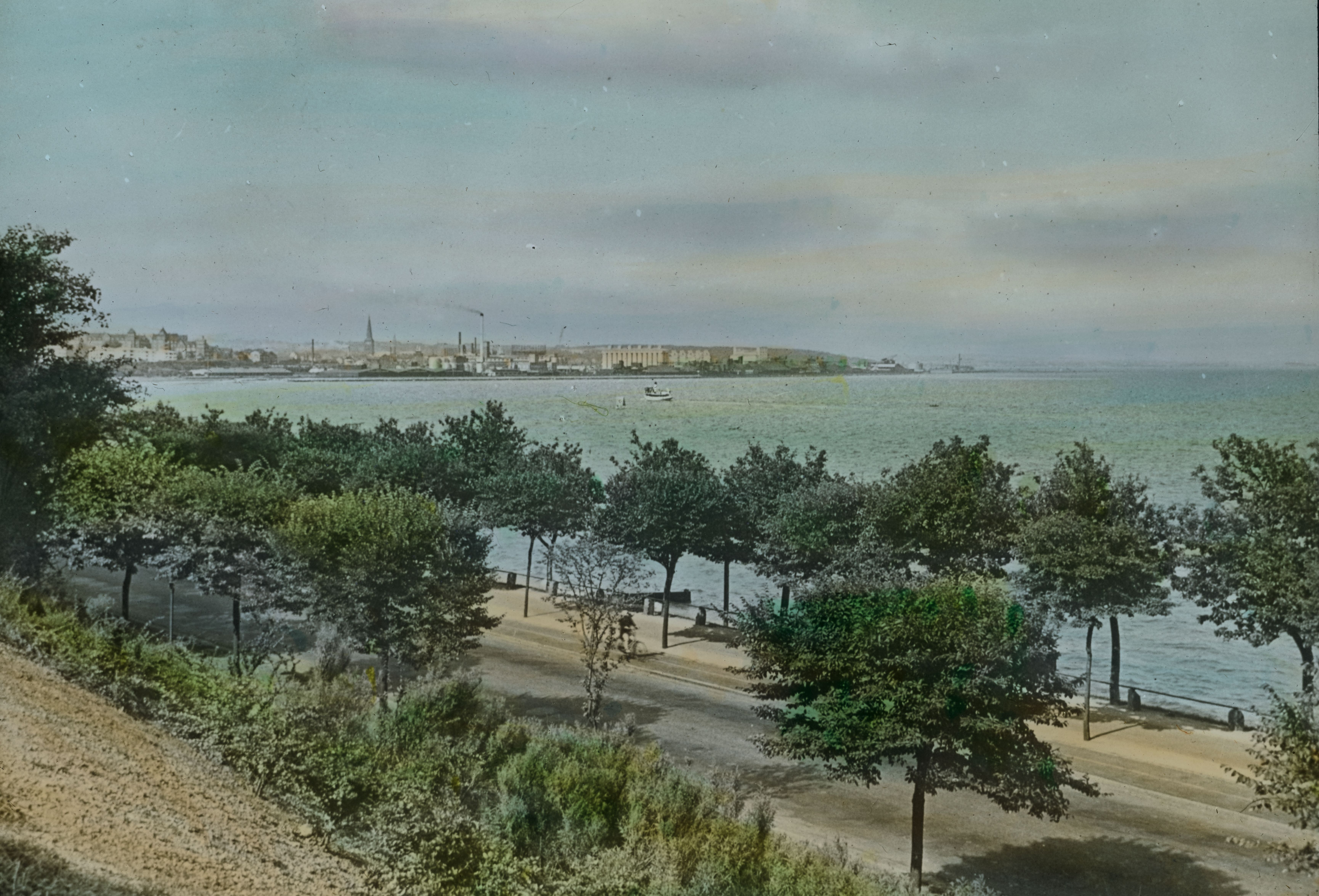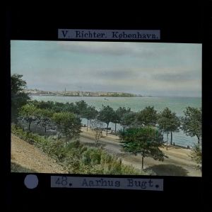Titel hentet fra original dias. Billedet er håndkoloreret og stammer fra lysbilledserie nr. 273 benævnt "Jeg tror der er skønnest i Danmark". På dias er påsat labels: "V. Richter. København." og "48. Aarhus Bugt.". I serien er 69 lysbilleder. Firmaet V. Richter producerede, kuraterede og distribuerede lysbilledserier i primært 1920'erne og 1930'erne. Dias måler ca. 8 x 8 cm.