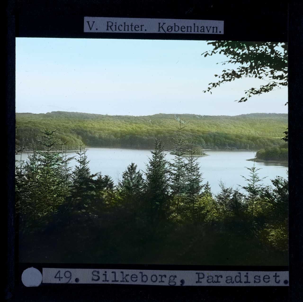 Billedet er håndkoloreret og stammer fra lysbilledserie nr. 273 benævnt "Jeg tror der er skønnest i Danmark". På dias er påsat labels: "V. Richter. København." og "49. Silkeborg, Paradiset.". I serien er 69 lysbilleder. Firmaet V. Richter producerede, kuraterede og distribuerede lysbilledserier i primært 1920'erne og 1930'erne. Dias måler ca. 8 x 8 cm.