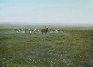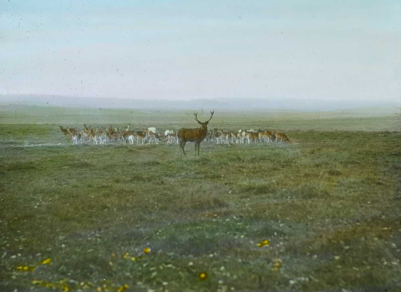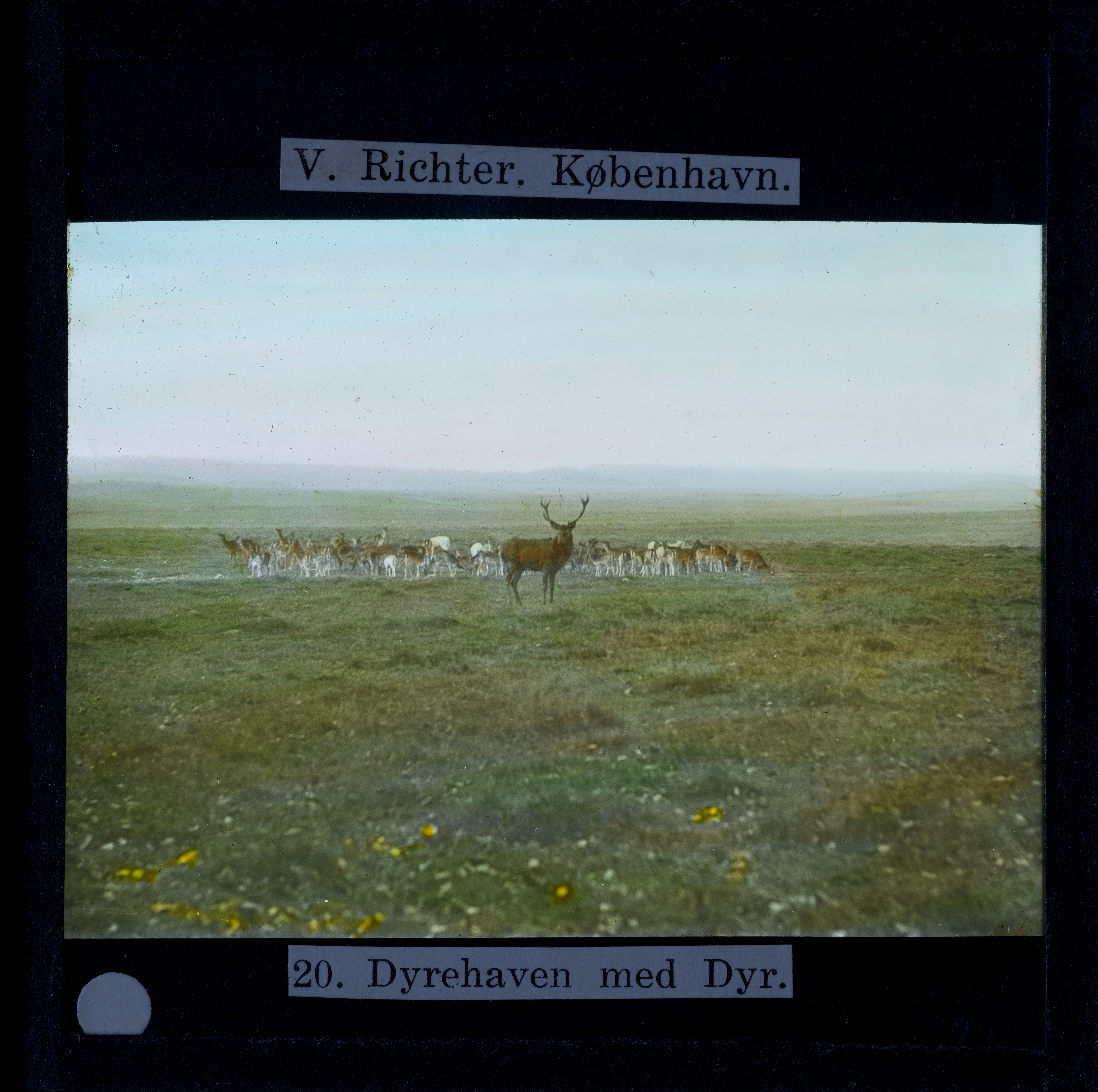Titel hentet fra original dias. Billedet er håndkoloreret og stammer fra lysbilledserie nr. 279 benævnt "Sommer i Danmark". På dias er påsat labels: "V. Richter. København." og "20. Dyrehaven med Dyr.". I serien er 40 lysbilleder. Firmaet V. Richter producerede, kuraterede og distribuerede lysbilledserier i primært 1920'erne og 1930'erne. Dias måler ca. 8 x 8 cm.