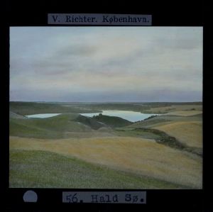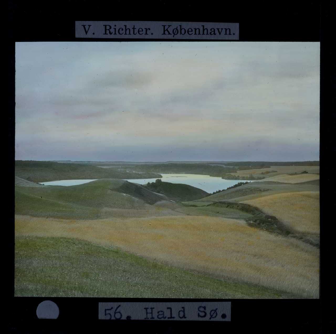 Titel hentet fra original dias. Billedet er håndkoloreret og stammer fra lysbilledserie nr. 273 benævnt "Jeg tror der er skønnest i Danmark". På dias er påsat labels: "V. Richter. København." og "56. Hald Sø.". I serien er 69 lysbilleder. Firmaet V. Richter producerede, kuraterede og distribuerede lysbilledserier i primært 1920'erne og 1930'erne. Dias måler ca. 8 x 8 cm.