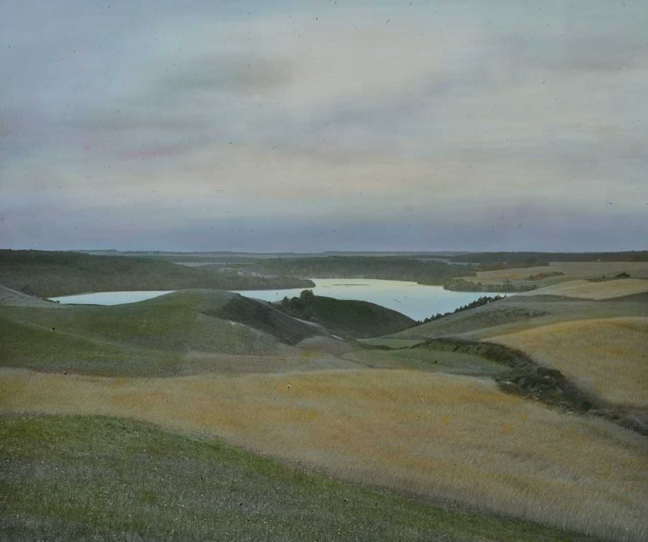 Titel hentet fra original dias. Billedet er håndkoloreret og stammer fra lysbilledserie nr. 273 benævnt "Jeg tror der er skønnest i Danmark". På dias er påsat labels: "V. Richter. København." og "56. Hald Sø.". I serien er 69 lysbilleder. Firmaet V. Richter producerede, kuraterede og distribuerede lysbilledserier i primært 1920'erne og 1930'erne. Dias måler ca. 8 x 8 cm.