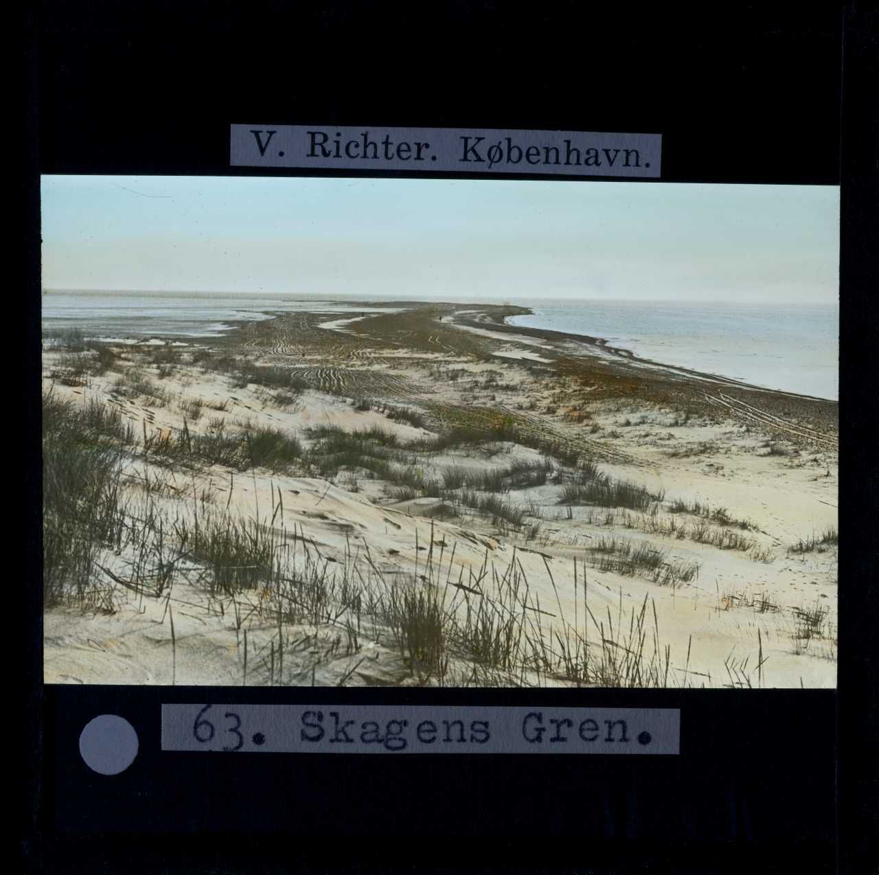 Billedet er håndkoloreret og stammer fra lysbilledserie nr. 273 benævnt "Jeg tror der er skønnest i Danmark". På dias er påsat labels: "V. Richter. København." og "63. Skagens Gren.". I serien er 69 lysbilleder. Firmaet V. Richter producerede, kuraterede og distribuerede lysbilledserier i primært 1920'erne og 1930'erne. Dias måler ca. 8 x 8 cm.