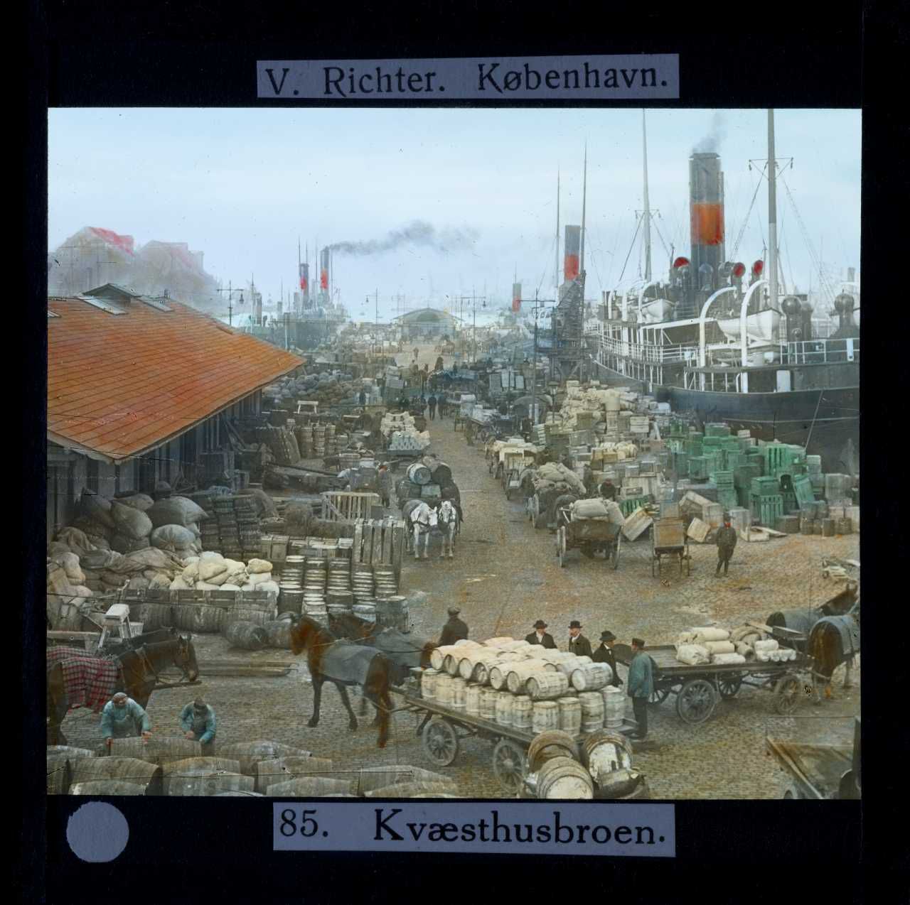 Billedet er håndkoloreret og stammer fra lysbilledserie nr. 2 benævnt "Øerne". På dias er påsat labels: "V. Richter. København." og "85. Kvæsthusbroen.". I serien er 49 lysbilleder. Firmaet V. Richter producerede, kuraterede og distribuerede lysbilledserier i primært 1920'erne og 1930'erne. Dias måler ca. 8 x 8 cm.