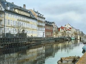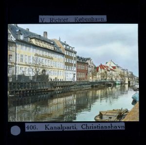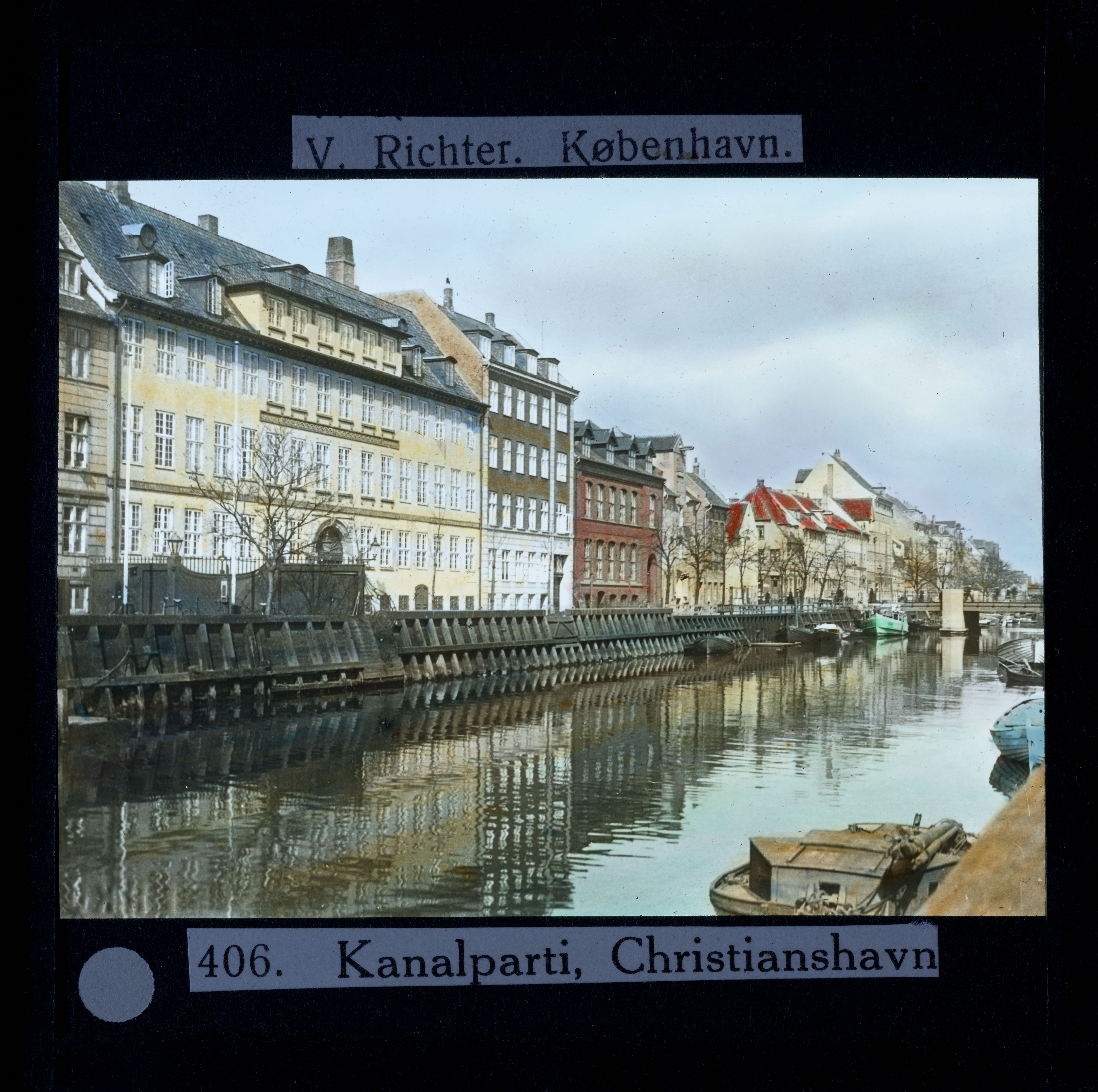 Billedet er håndkoloreret og stammer fra lysbilledserie nr. 2 benævnt "Øerne". På dias er påsat labels: "V. Richter. København." og "406. Kanalparti, Christianshavn". I serien er 49 lysbilleder. Firmaet V. Richter producerede, kuraterede og distribuerede lysbilledserier i primært 1920'erne og 1930'erne. Dias måler ca. 8 x 8 cm.
